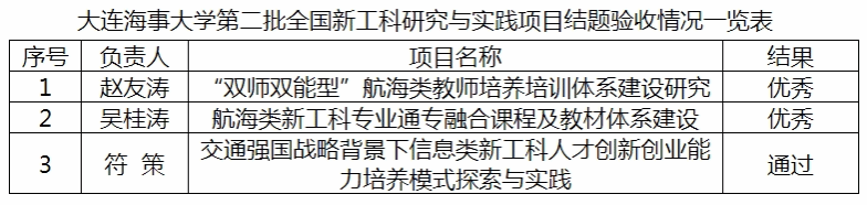 根据《教育部办公厅关于公布第二批全国新工科研究与实践项目结题验收结果的通知》(教高厅函〔2023〕21 号),大连海事大学2020年获批的3项国家级新工科研究与实践项目全部通过结题验收。其中赵友涛教授负责的《“双师双能型”航海类教师培养培训体系建设研究》、吴桂涛教授负责的《航海类新工科专业通专融合课程及教材体系建设》项目获评优秀。