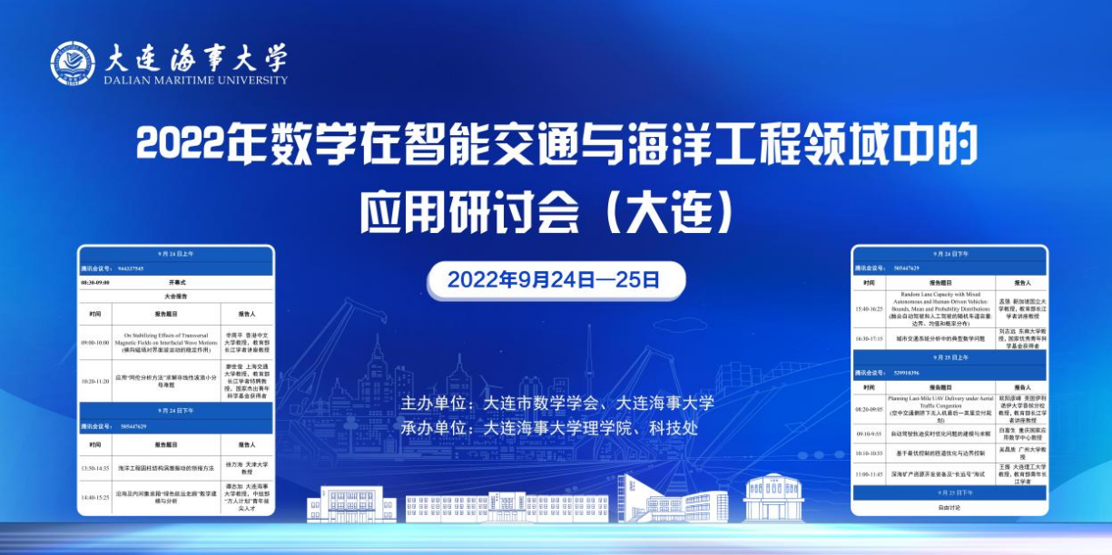 为了促进数学在智能交通与海洋工程领域中的应用,加强国内外学者之间的学术交流与合作,2022年“数学在智能交通与海洋工程领域中的应用研讨会(大连)”于9月24-25日在我校举行,会议由大连市数学学会与大连海事大学共同主办,我校理学院与科技处共同承办。副校长初北平出席开幕式并致辞,会议由理学院院长孙怡东主持。