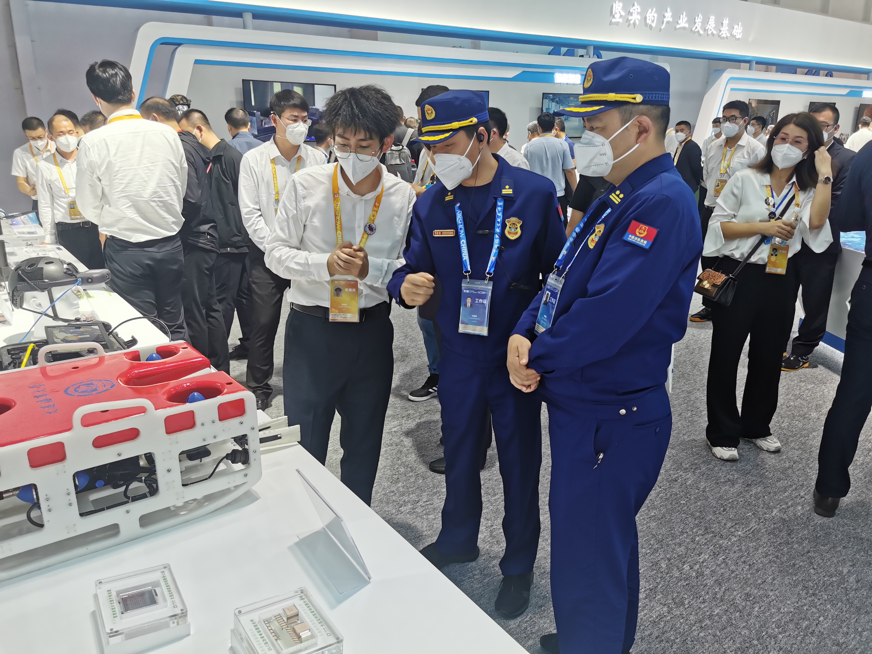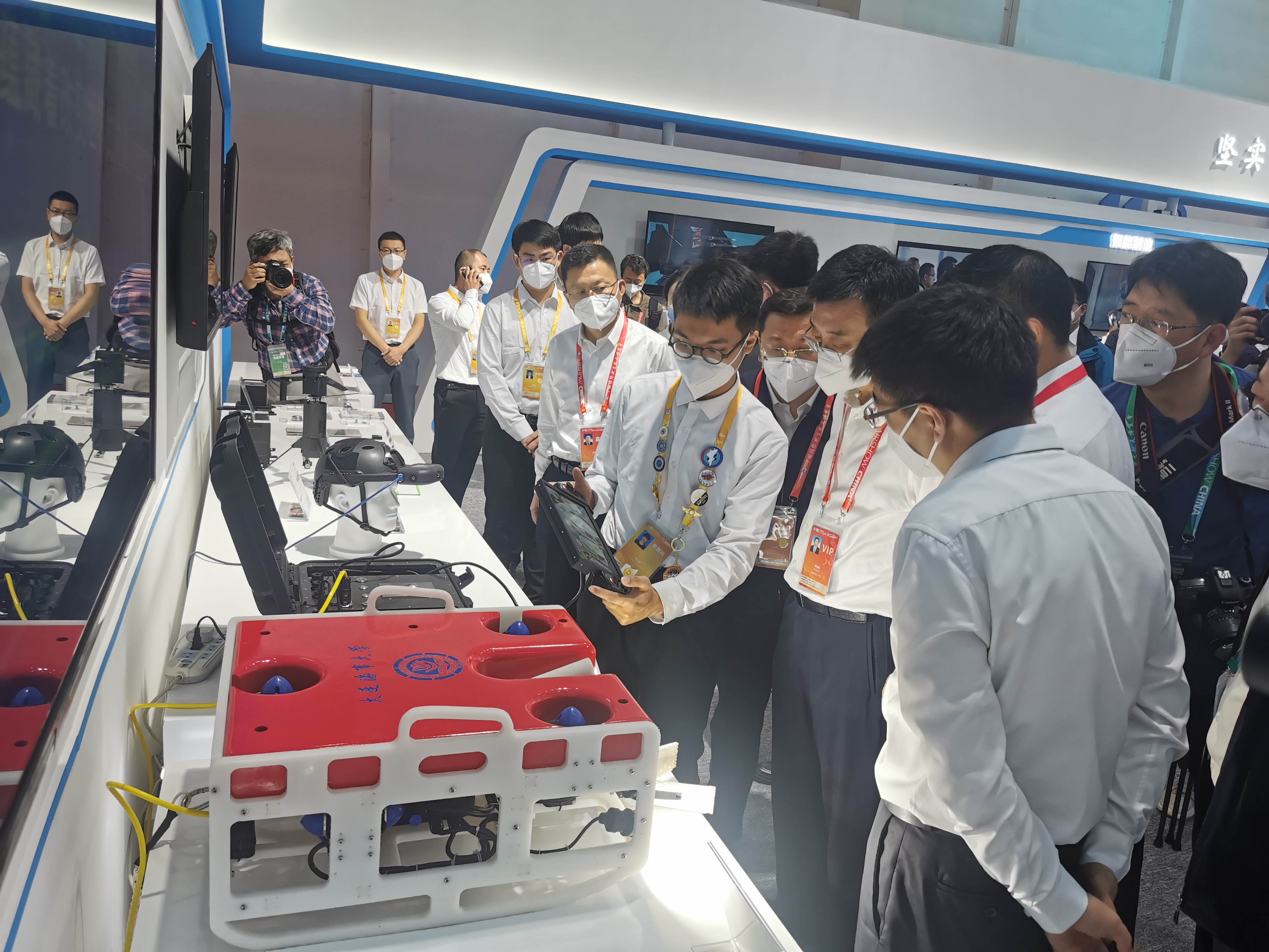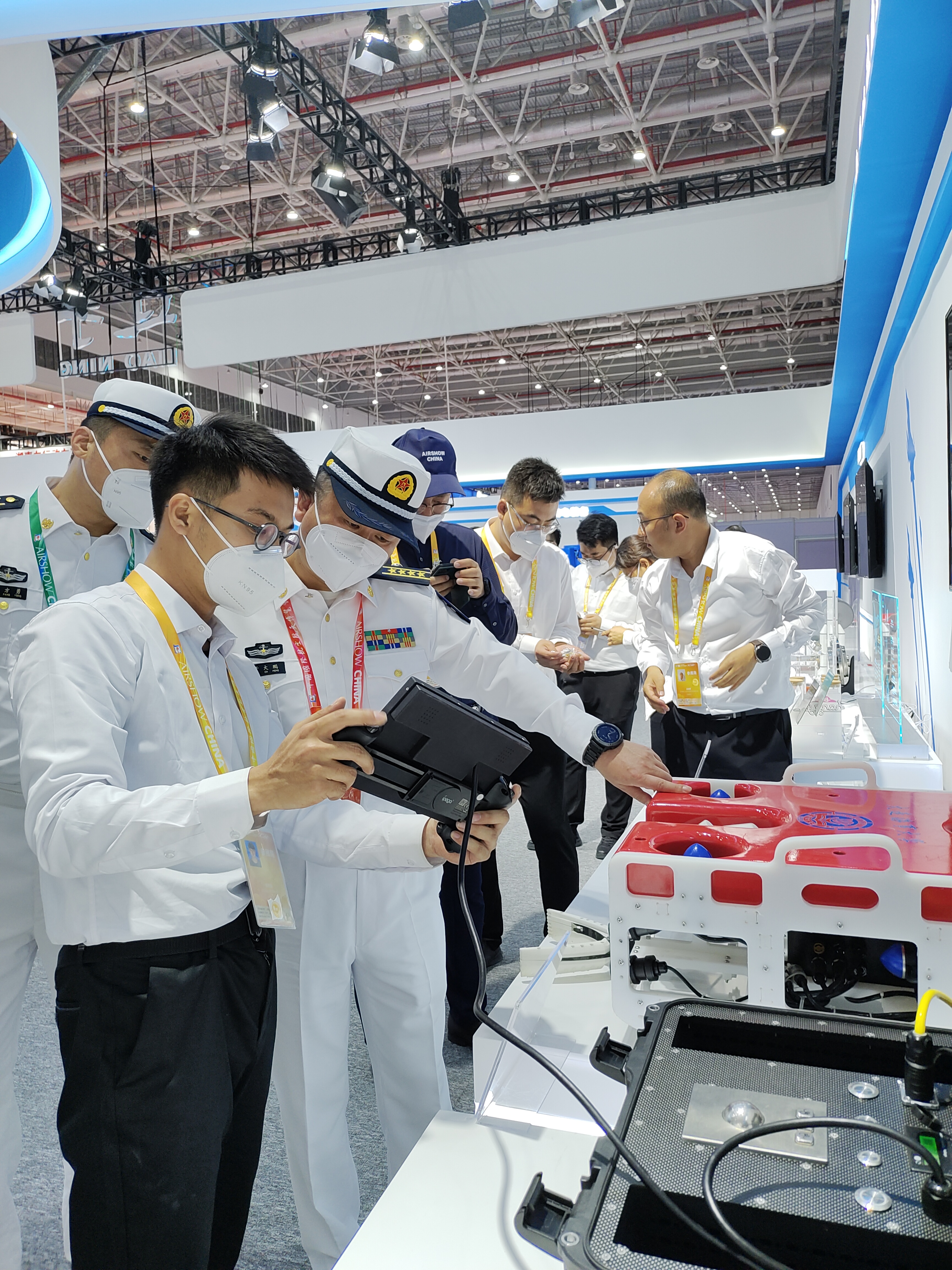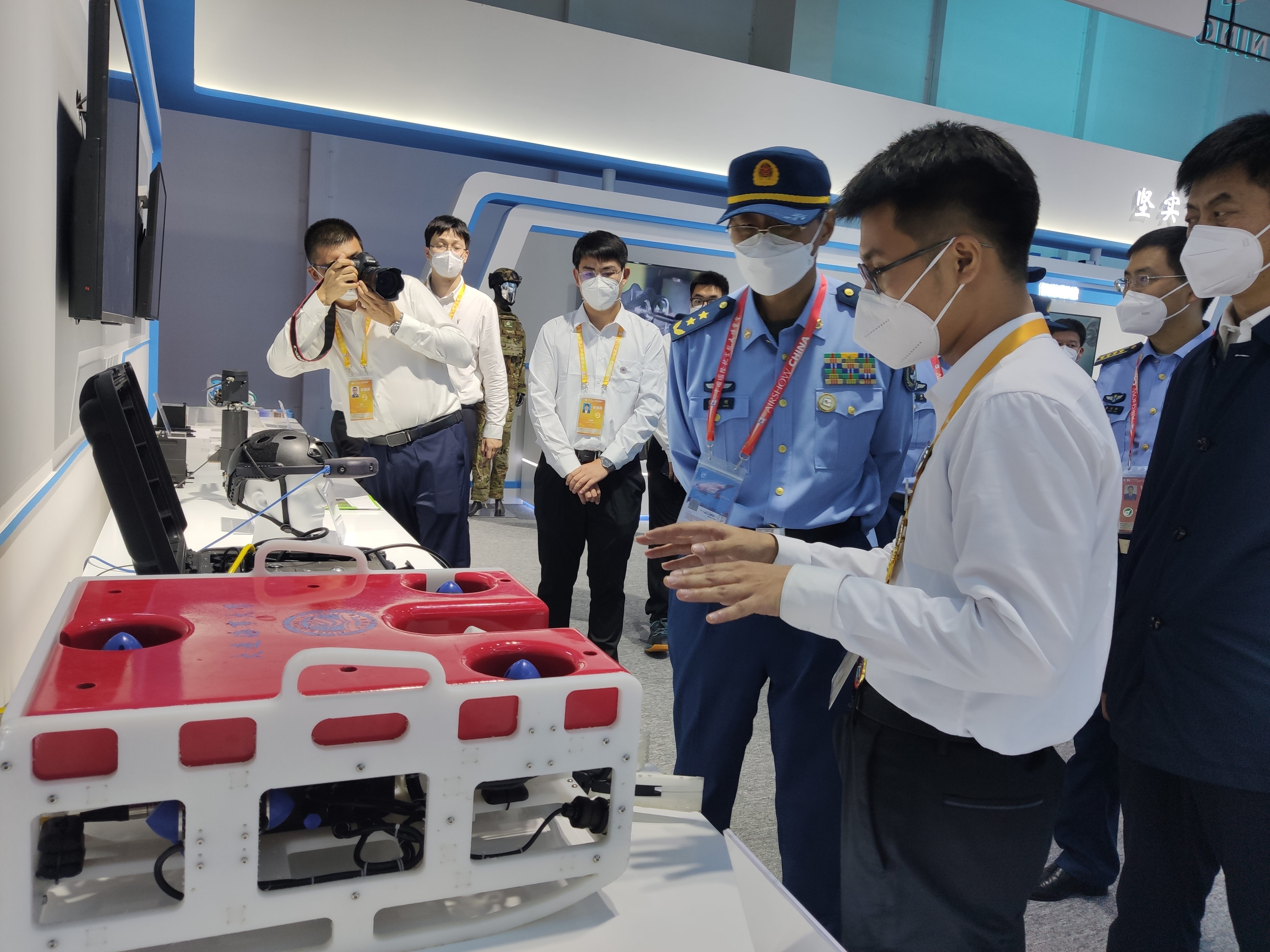 本次博览会,学校派出“海鸥号”水下机器人参加。“海鸥号”是由我校信息科学技术学院付先平教授团队自主研发的一款水下机器人,搭载了水下高清相机,可根据任务类型选配的机械手、深水补光灯等设备,可用于海洋探测、海洋考古、海洋牧场等领域。“海鸥号”以稳定的软硬件系统、出色的控制单元和强大的水下图像实时处理能力而著称,已达国内领先水平。航展期间,我校水下机器人科研团队人员在现场演示讲解,“海鸥号”以抓取效率高、作业稳定性强、能获取高清水下图像的特点获得了军方以及相关单位的充分肯定和高度关注。