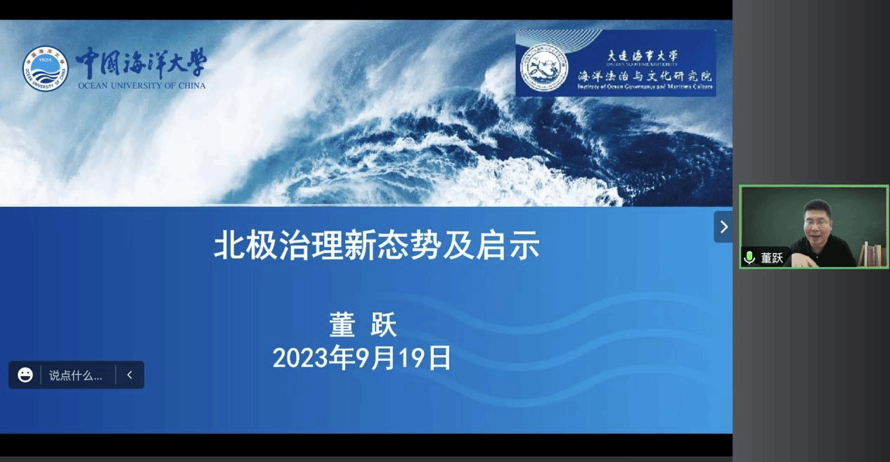 2023年9月19日下午,我校本年度第14期(总第70期)浩海沙龙于线上成功开展,此次浩海沙龙的主题为“北极治理新态势及其启示”。此次会议由“浩海工程”培养人选韩立新教授担任主持人,由中国海洋大学法学院副院长、博士生导师董跃教授担任主讲人。