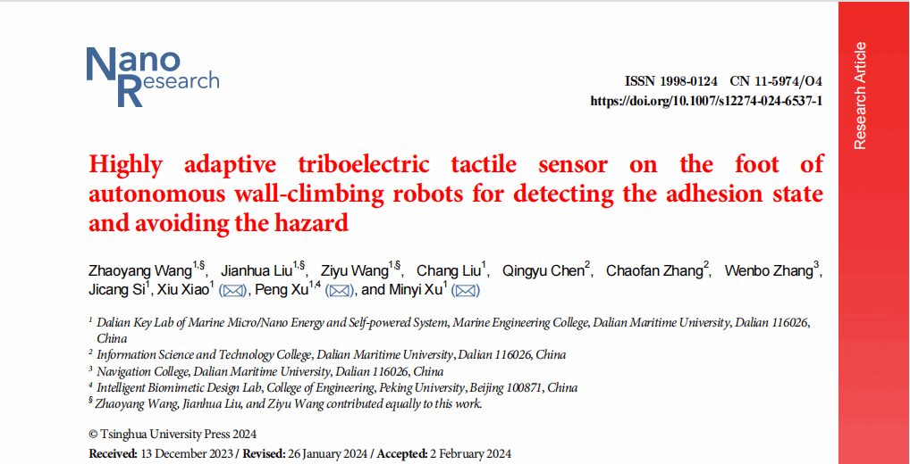 近日,轮机工程学院徐敏义团队在《Nano Research》上发表最新研究论文"Highly adaptive triboelectric tactile sensor on the foot of autonomous wall-climbing robots for detecting the adhesion state and avoiding the hazard"。这项工作提出了一种高适应性摩擦电触觉传感器,用于检测腿足式磁吸附爬墙机器人的磁吸附状态,提高机器人自主爬行的避障能力和安全性。