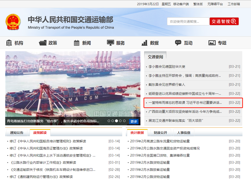 一直以来,交通运输部党组高度重视大连海事大学思想政治工作。部党组书记杨传堂、部长李小鹏连续五年来校为师生上党课、思政课。学校党委书记郑少南、校长孙玉清连续多年带头走上讲台讲授思政课,各二级学院党组织书记、院长定期为学生授课,实现了部、校、院三级领导干部授课全覆盖。