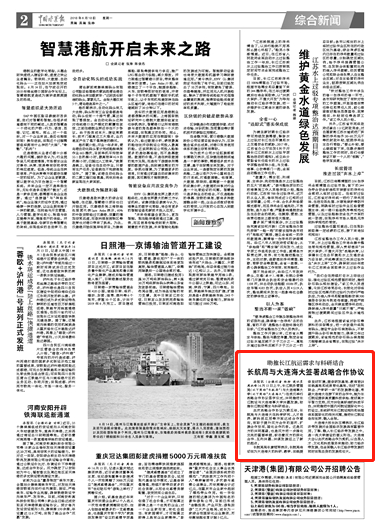 本报讯(全媒记者 杨柳 通讯员 周永峰)6月15日上午,长江航务管理局(以下简称“长航局”)与大连海事大学(以下简称“大连海大”)在武汉举行战略合作协议签字仪式,共同推进长江航运与大连海事大学共赢发展,助推长江航运需求与科研结合。