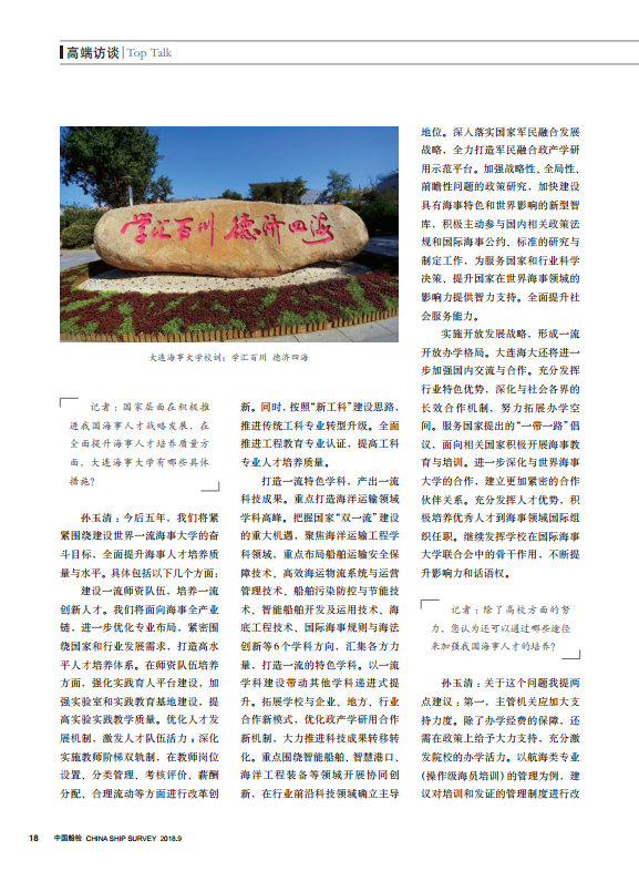 随着国际海事业的飞速发展,船舶大型化、智能化以及无人船、智能港口的出现对如今海事人才的培养提出了更高的要求。在智能时代来临的当下,我国的海事人才面临哪些新的挑战,作为海事人才培养的高等学府,大连海事大学又采取了哪些与时俱进的措施积极应对?对此,本刊记者专访了大连海事大学孙玉清校长。