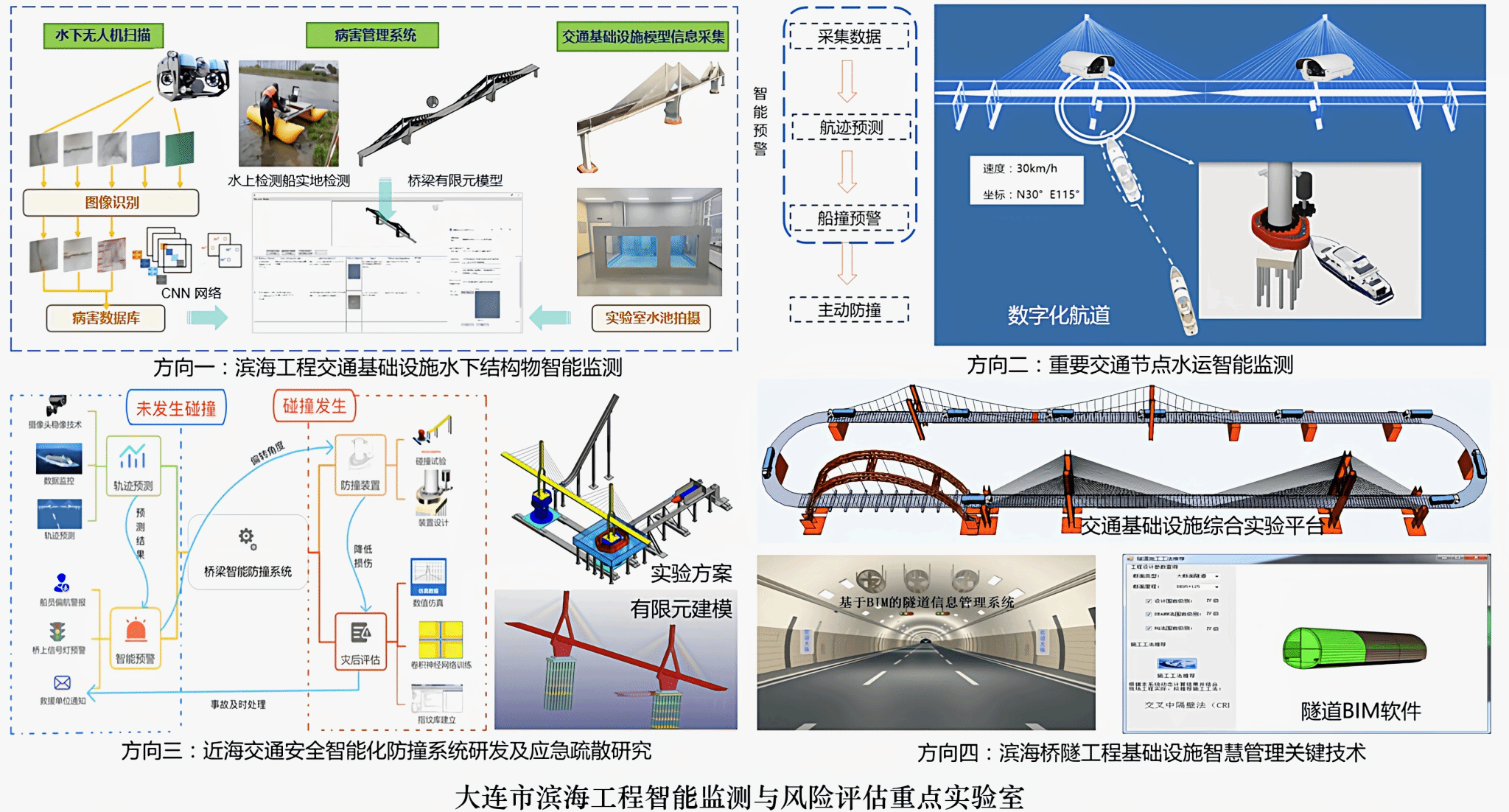 实验室围绕滨海工程安全管理的需求,结合物联网、大数据、人工智能等技术,通过研究滨海工程结构物监测系统、水面船只监测系统、数字航道、风险智能响应系统及主动防撞装置,构建滨海交通工程智能监测和风险评估平台,实现滨海工程的安全评估、预警与智慧管理。设置了四个研究方向: