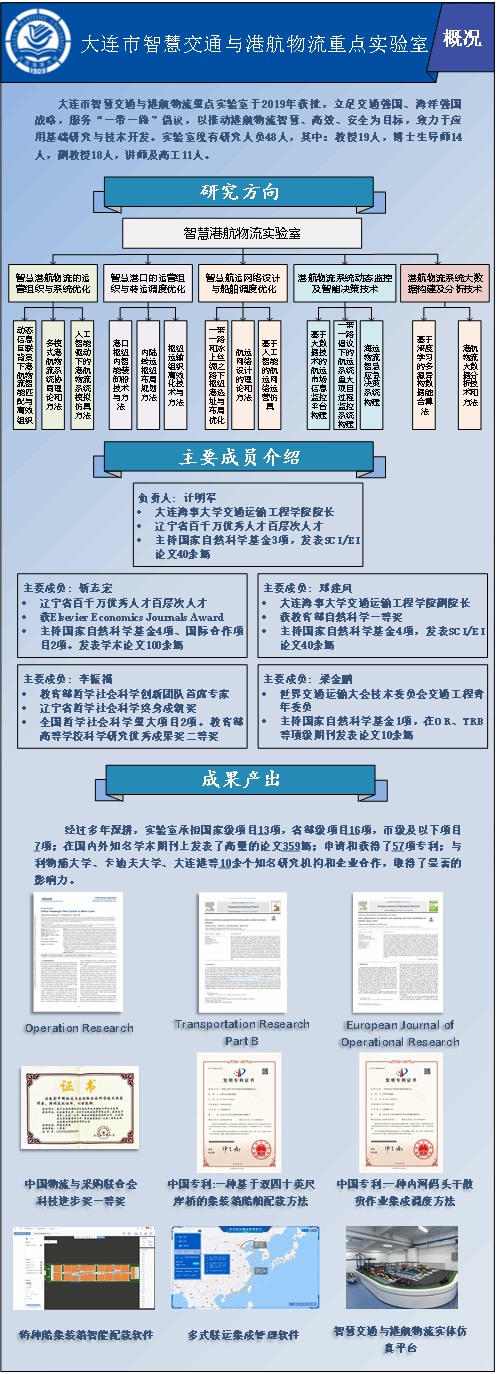 大连市智慧交通与港航物流重点实验室(以下简称实验室)由大连市科技局于2019年9月10日正式批准立项的大连市重点实验室。
