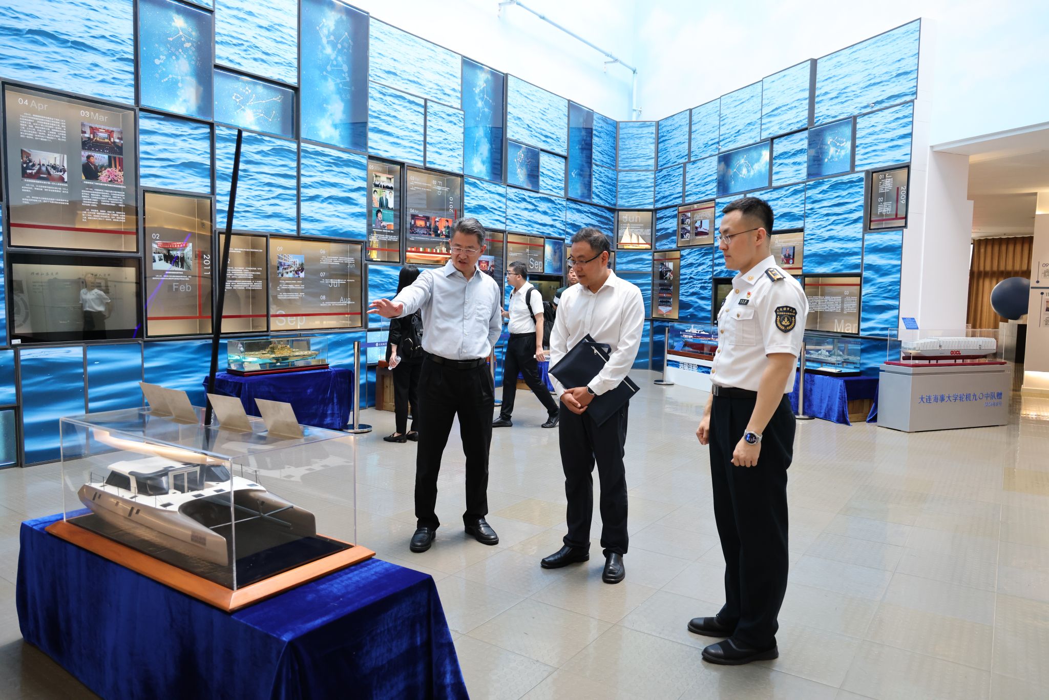 调研期间,陈帅一行参观了学校航海教育博物馆、智能船岸基远程控制中心,调研了解学校历史、文化、发展建设历程以及智能船关键技术研发应用情况。