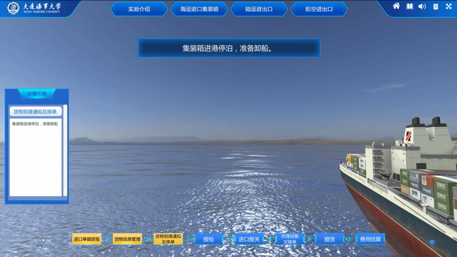 船舶操纵与避碰虚拟仿真教学创新实验室按照“虚实结合、以虚补实”的原则,以船舶海上航行过程中遇到的不同会遇局面为切入点,选取对遇局面、追越局面、交叉相遇局面等3种船舶会遇局面及能见度不良情况,采用3D建模、动画、语音识别、人机交互等技术自主研发了船舶操纵与避碰虚拟仿真实验,以解决现实中专业化航海人才培养的瓶颈。