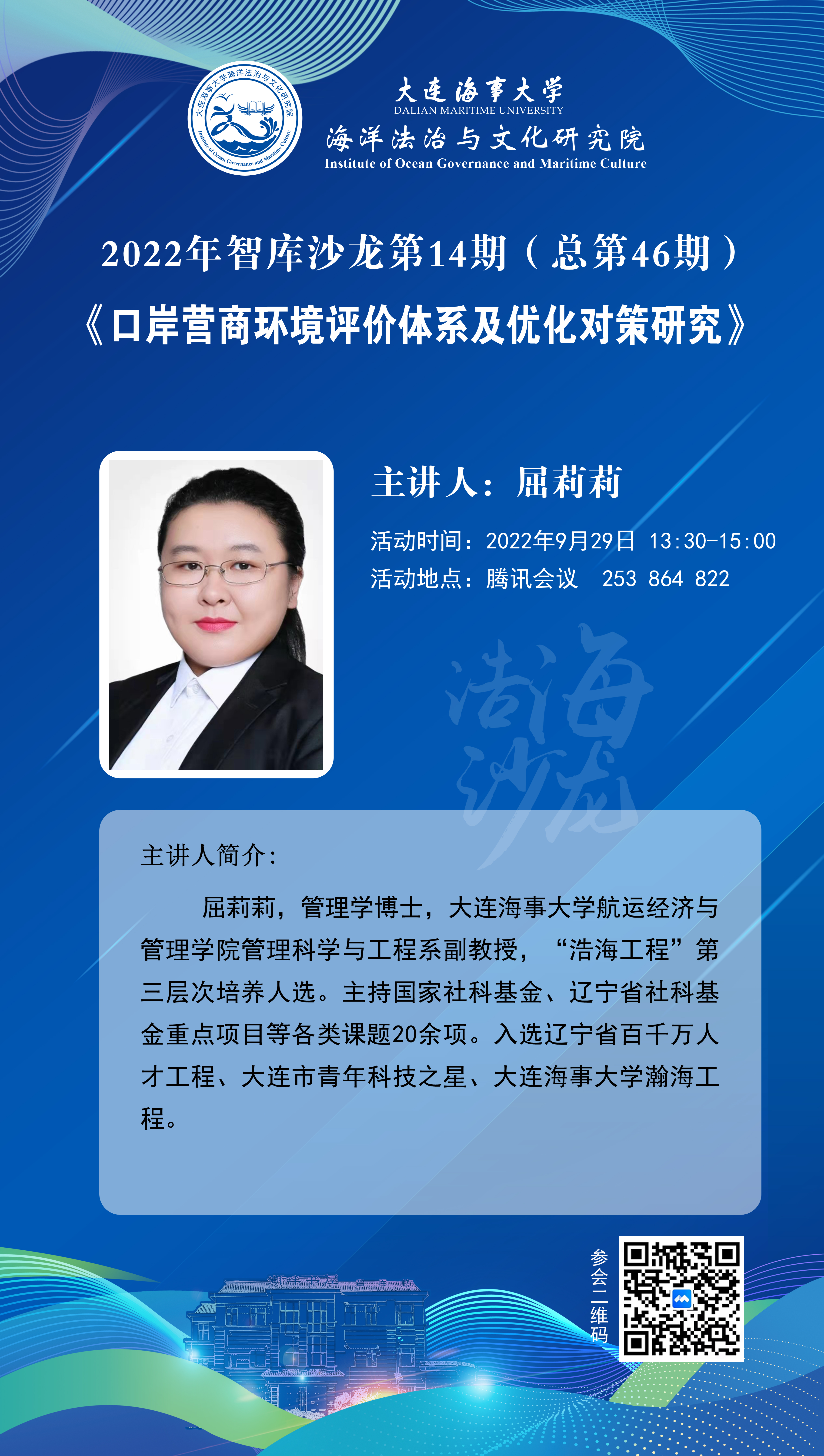 屈莉莉,管理学博士,大连海事大学航运经济与管理学院管理科学与工程系副教授,“浩海工程”第三层次培养人选。主持国家社科基金、辽宁省社科基金重点项目等各类课题20余项。入选辽宁省百千万人才工程、大连市青年科技之星、大连海事大学瀚海工程。