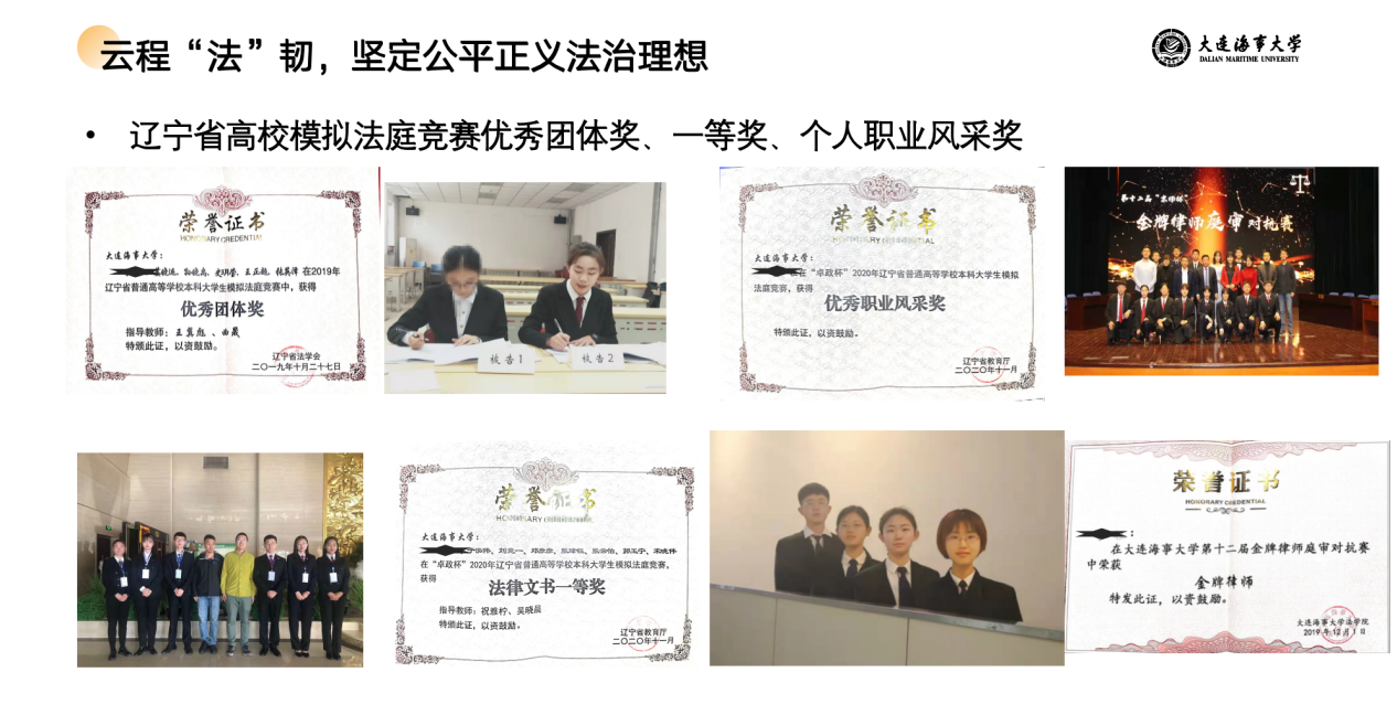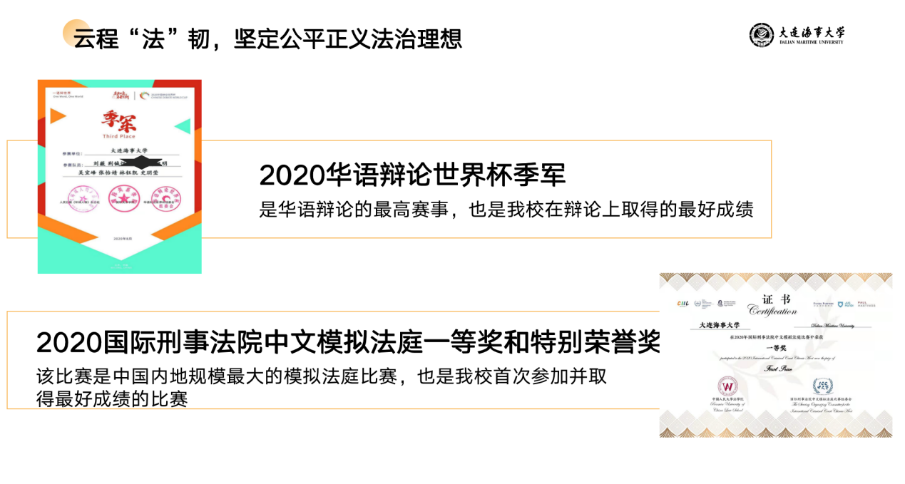 科研竞赛方面,她在2020年参加国际刑事中文模拟法庭(ICC)获得了一等奖和特别荣誉奖。该比赛是中国内地规模最大的模拟法庭比赛,也是我校首次参加并取得最好成绩的比赛,她是其中年级最小的本科生。2019年和2020年两次参加辽宁省普通高等学校模拟法庭比赛,2019年获得了优秀团体奖,2020年获得个人优秀职业风采奖和法律文书一等奖。她参加校辩论队获得2020华语辩论世界杯季军,这是我校参赛以来取得的最好成绩。此外,还获得国家、省市和校级荣誉30多项。