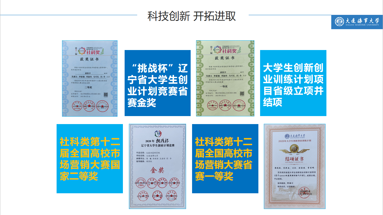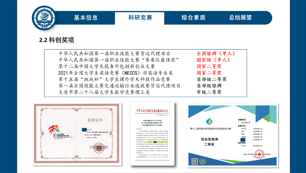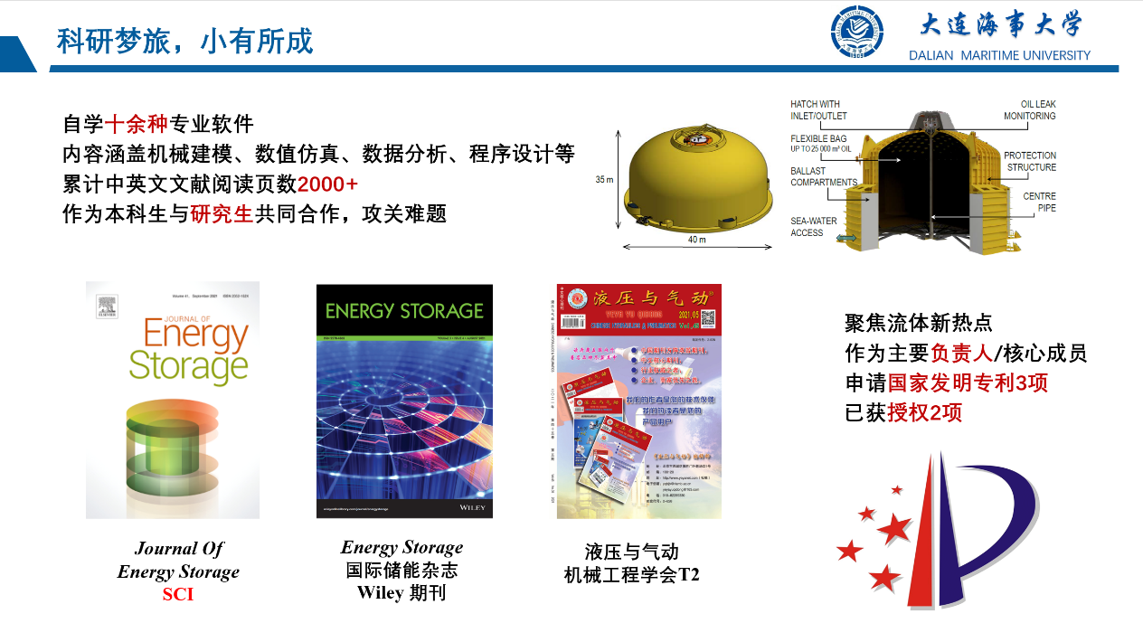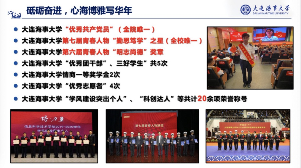他曾参与国家自然科学基金面上项目,参与《航海学》英文版教材的修编工作和《航海类专业学生职业发展与就业指导》教材的编写工作。此外,他还获得过全国高校市场营销大赛国家二等奖、挑战杯辽宁省省赛金奖,省级大创,互联网+以及各类校级奖项,他参加的“AI溢油监测应急指挥系统”项目,现已成功在山东莱州港投入使用。目前,他已报名参加了学校具有航海类专业背景师资选培计划,并通过了学院考核这一环节。明年他将到天津大学攻读硕士学位。为母校、为新时代航海建设而奋斗。