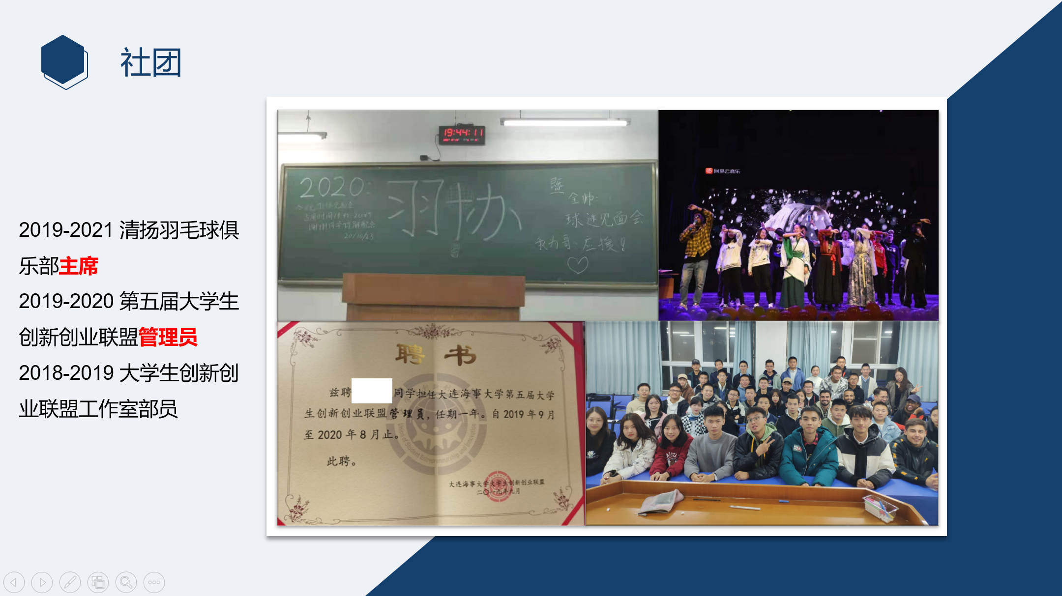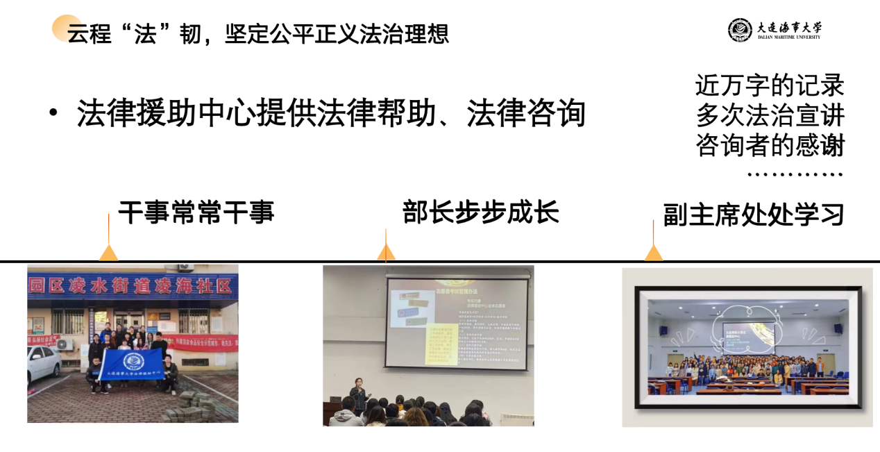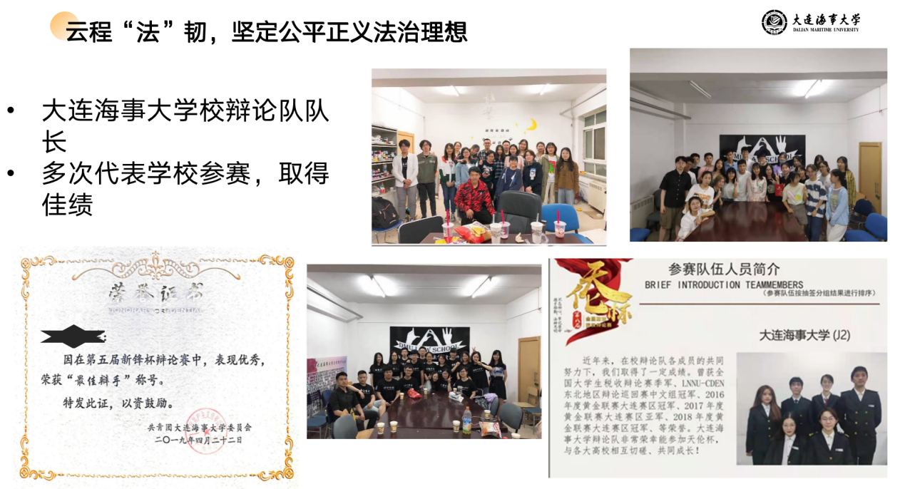 社团生活方面,在出色完成学业之余,加入了大连海事大学法律援助中心和大连海事大学校辩论队,并在法律援助中心担任副主席,担任校辩论队队长。她在法律援助中心组织了法律文化节、宪法日、法律文书等活动、参与了凌水街道等地方的普法宣传活动,尤其是在疫情期间通过线上征集为咨询者提供法律咨询服务,帮助中心获得校级优秀社团的荣誉称号。同时,帮助校辩论队取得多场比赛的胜利。她在寒暑假中积极参加社会实践活动,参加了学校母校行活动,2020年,在江西省鹰潭市法律援助中心担任法律援助热线的法律咨询专员,她所负责的热线电话的接通率和满意度均在全省名列前茅。