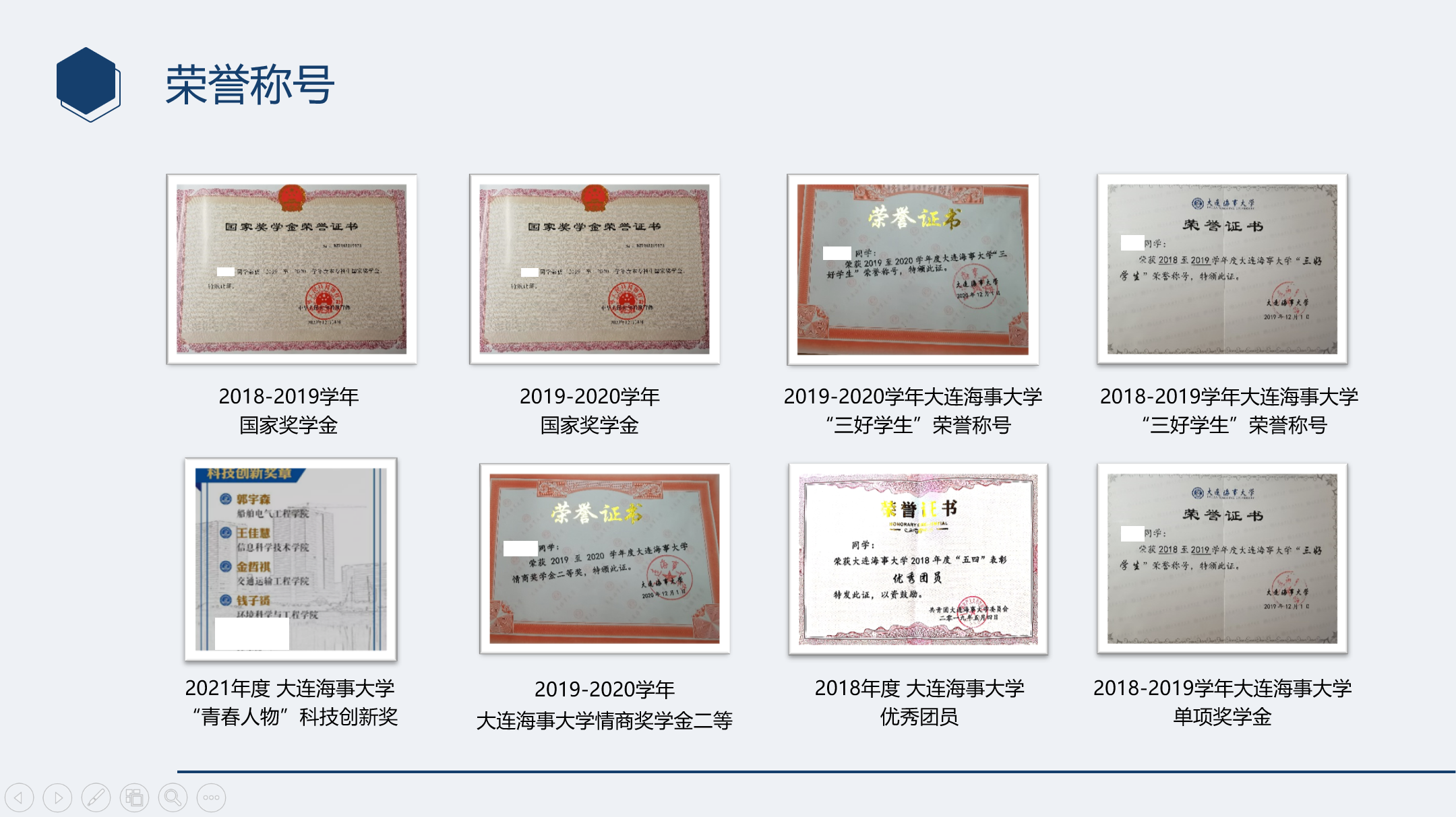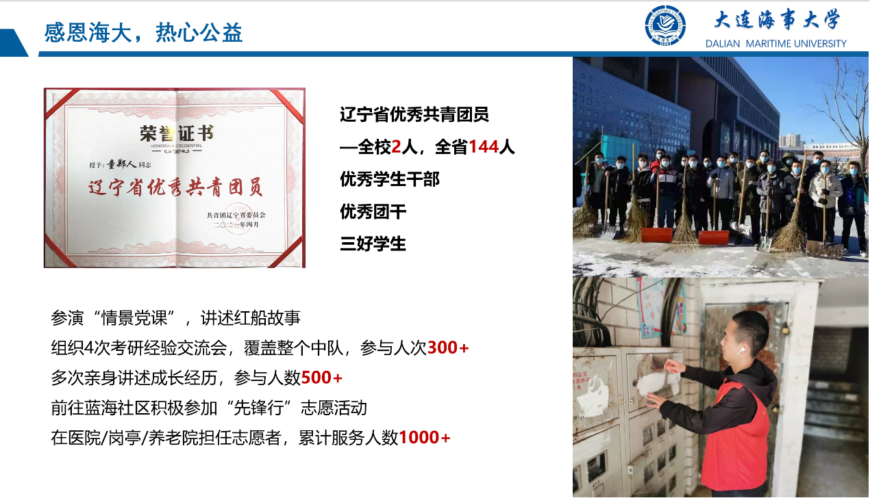 思想政治方面,他积极向党组织靠拢,参与“情景党课”设计展示大赛,锤炼党员党性意识。他热爱工作、甘于奉献,始终牢记同学和老师们在成长过程中提供的帮助,立志回报学校,坚持为同学们服务。作为中队学委和副指导员,他负责协调学院学生的学习工作。在中队工作期间,组织举办多次考研经验分享会,为同学们开辟与优秀学长学姐沟通的桥梁,累计参于达200余人次,并积极分享学习和科研的经验,主讲多次经验分享会,累计覆盖500余人次。疫情期间,多次协助组织同学们开展学业帮扶活动,开展与同学们的一对一辅导,针对课程重难点进行知识点的讲解和例题解析,帮助同学们明确疫情期间的学习目标,提高网上教学质量。经过不懈努力,目前,中队全体成员的平均绩点已基本达2.0及以上,学业帮扶工作成果显著。获得国家奖学金、国家励志奖学金、辽宁省优秀共青团员、大连海事大学三好学生、优秀团干等荣誉多项。社会工作方面,他积极主动地参加志愿服务,多次参加学院“先锋行”志愿活动,积极帮助蓝海社区居民改善社区环境。