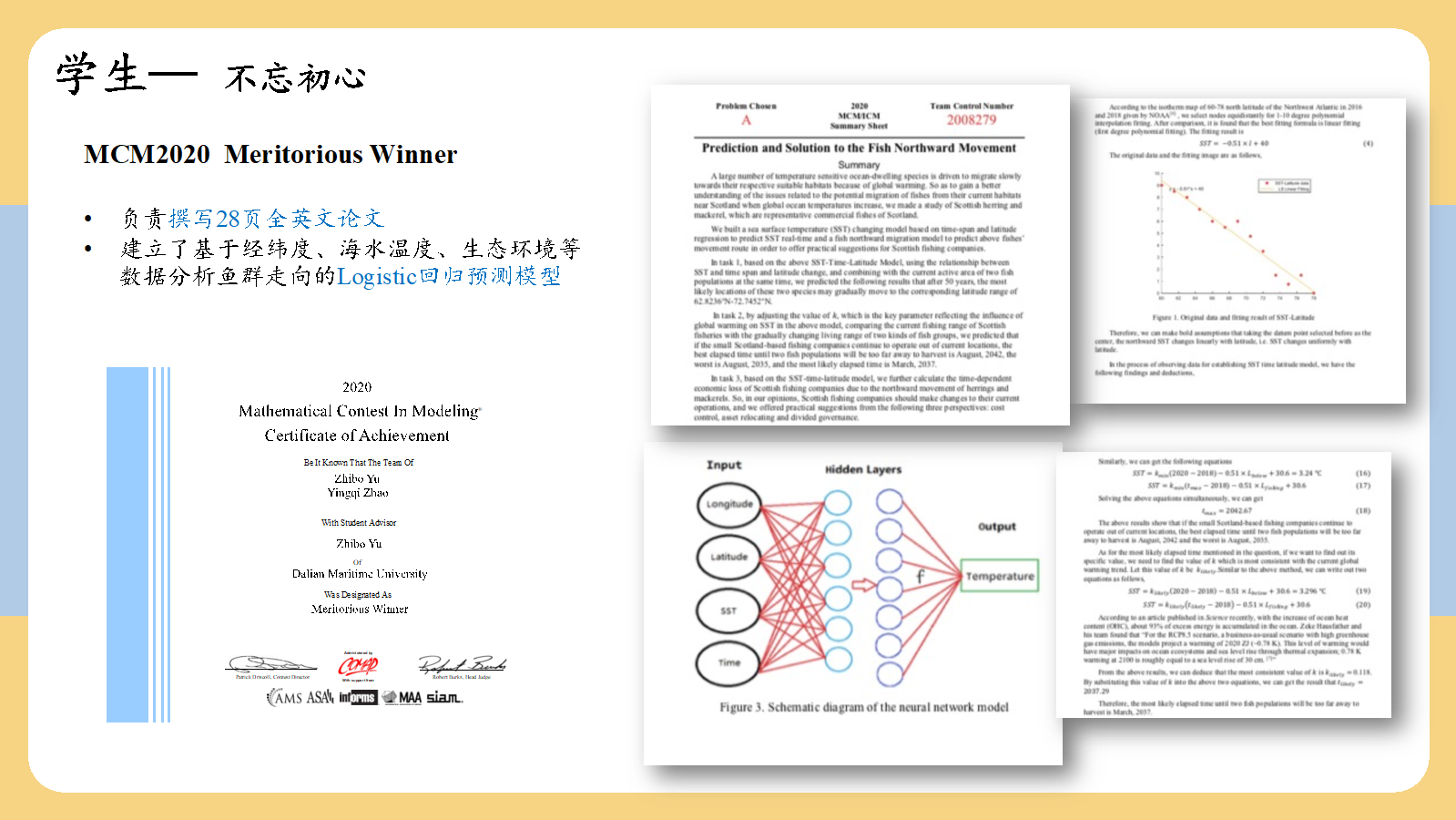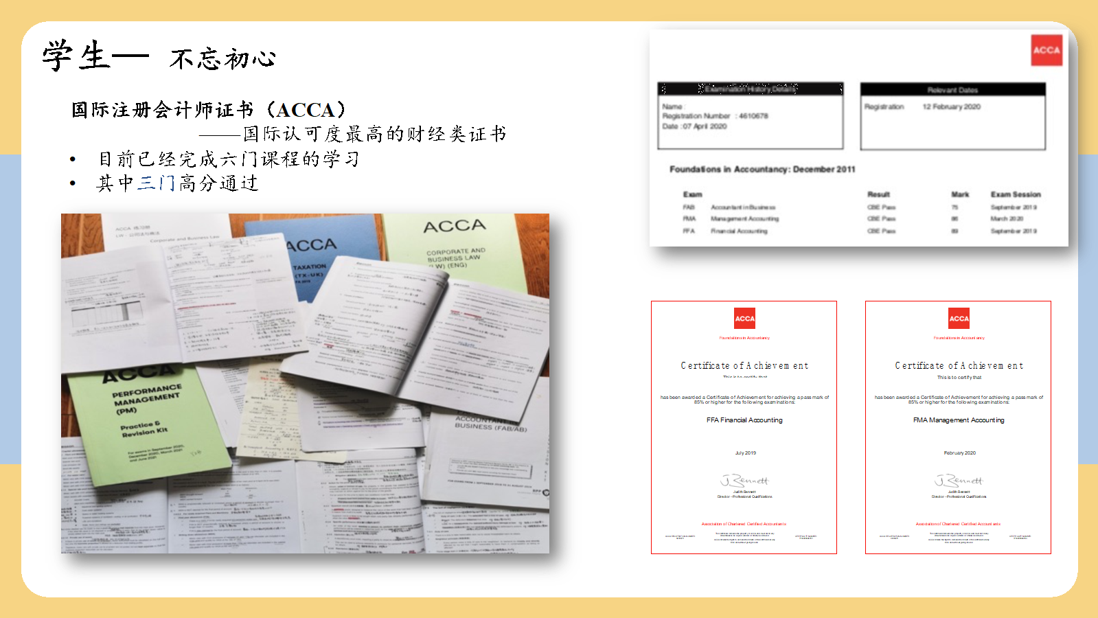 她立志成为一名“外语+”复合型人才。自学数学建模,带队参加美国大学生数学建模大赛,撰写28页全英论文,负责建立回归预测模型,获全球一等M奖,为学院历史最高。同时,零基础跨考国际认可度最高的财经证书ACCA,已完成六门课程的学习,三门高分通过。