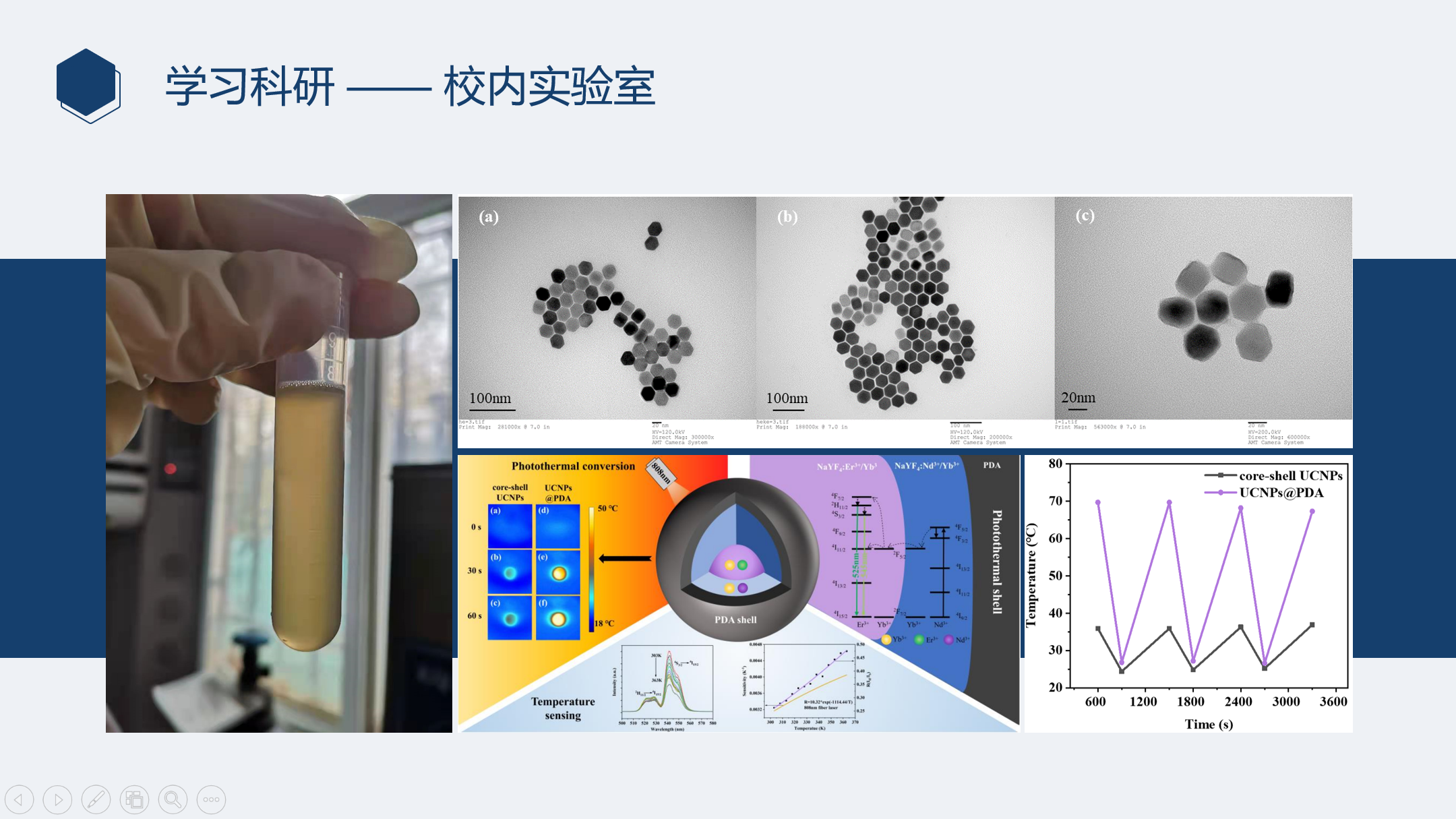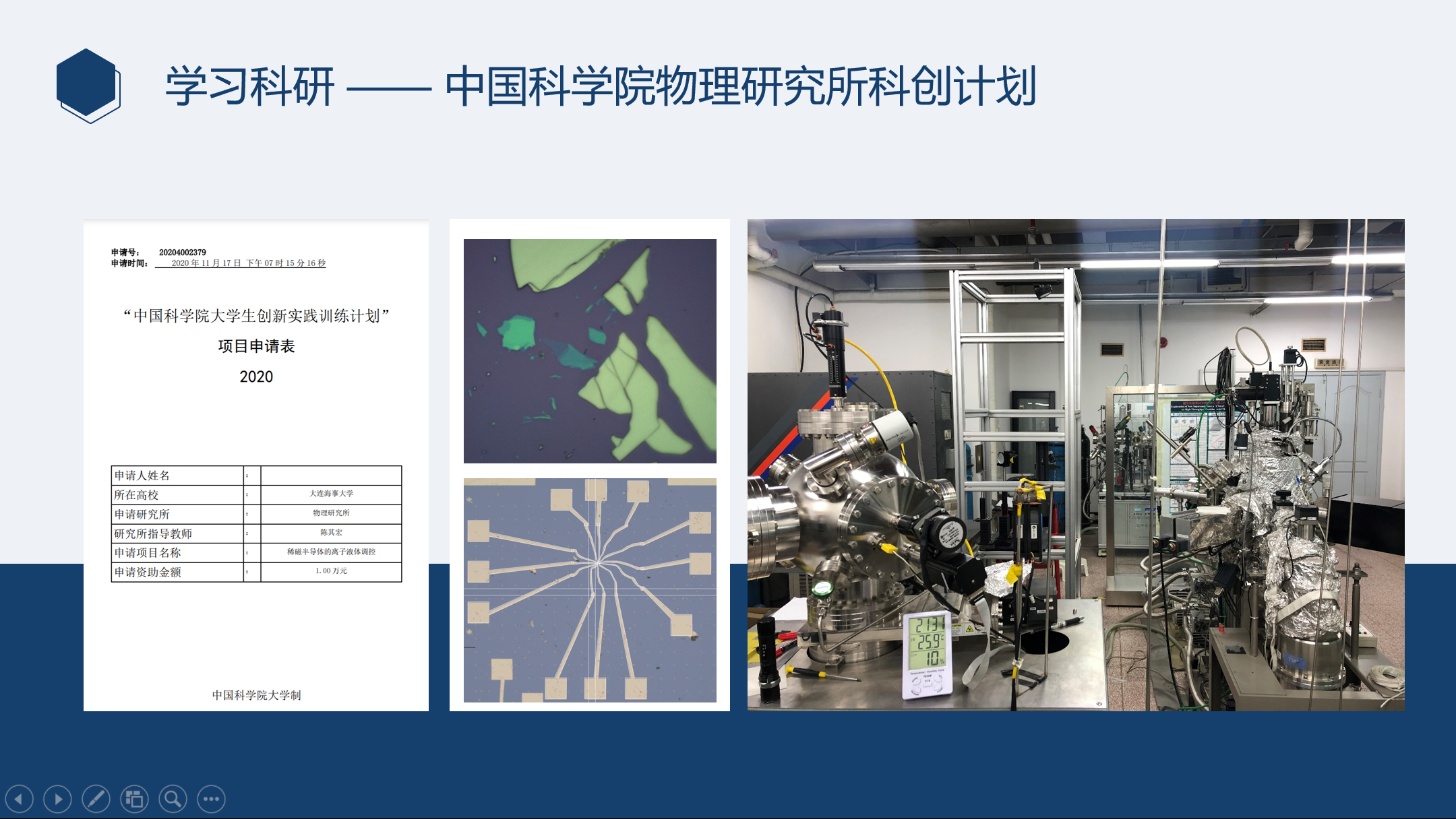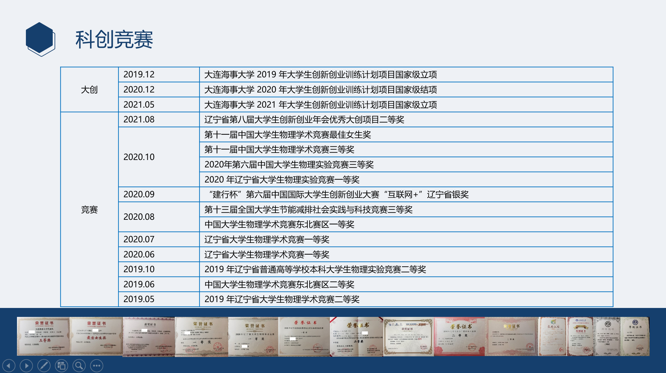 在大二的第一学期,她参加了理学院“本科生进实验项目”,进入了理学院转换发光实验室,期间发表了 SCI 论文两篇,参与发表二区一篇、一作二区在投。她利用疫情在家的寒假时间,怀揣着对物理的热爱,她联系了中国科学院物理研究所的研究员,并申请了中国科学院大学生创新实践训练计划,获得一万元奖学金资助。除此之外,她连续三年都以负责人身份参与了大学生创新创业训练计划,并已获得了两项国家级结项,一项国家级立项,并以第一发明人身份拥有已授权实用新型专利两项。在大学三年中,她参加了诸多物理学科代表竞赛,在第十一届中国大学生物理学术竞赛中,以校物理竞赛队队长身份带领队伍在国赛中夺得三等奖,位列全国高校第36位,保送海大进入下一届的总决赛,并以出色的表现荣获最佳女生奖,全国仅3人,为我校至目前唯一一人;其它,在中国大学生物理实验竞赛、全国大学生节能减排社会实践与科技竞赛获国家级三等奖、其余省级奖项十余项,第六届中国国际大学生创新创业大赛“互联网+”辽宁省银奖,个人累计获得国家级奖项7项,省级奖项10余项。