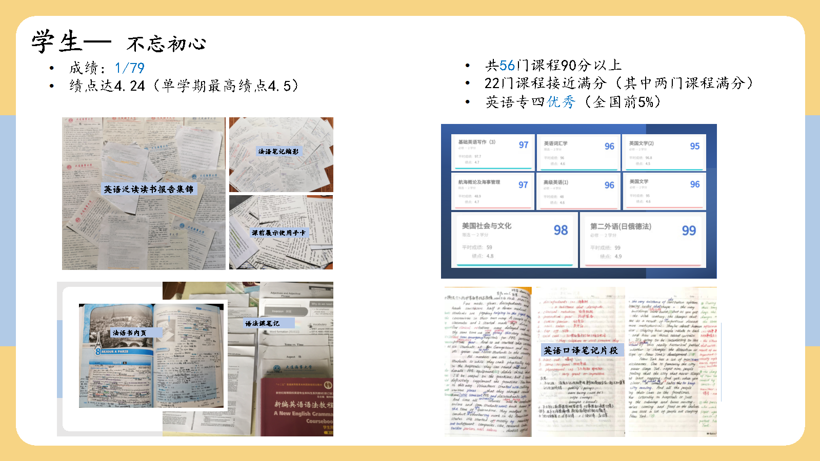 作为学生,没有人比她更懂得再度坐在课堂学习的可贵。大学三年,每一堂课,每一份作业,每一次考试,她都全力以赴。每学期成绩均为第一,平均绩点4.24,单学期最高4.5,56门课程90分以上,多次刷新最高分纪录,专四优秀。扎实听说读写的同时,积极参加枫叶杯等比赛,并多次获奖;累计获国家奖学金等二十余项荣誉奖项。