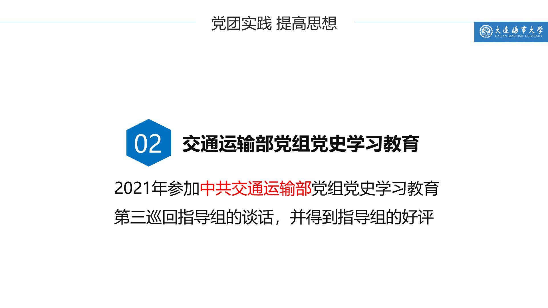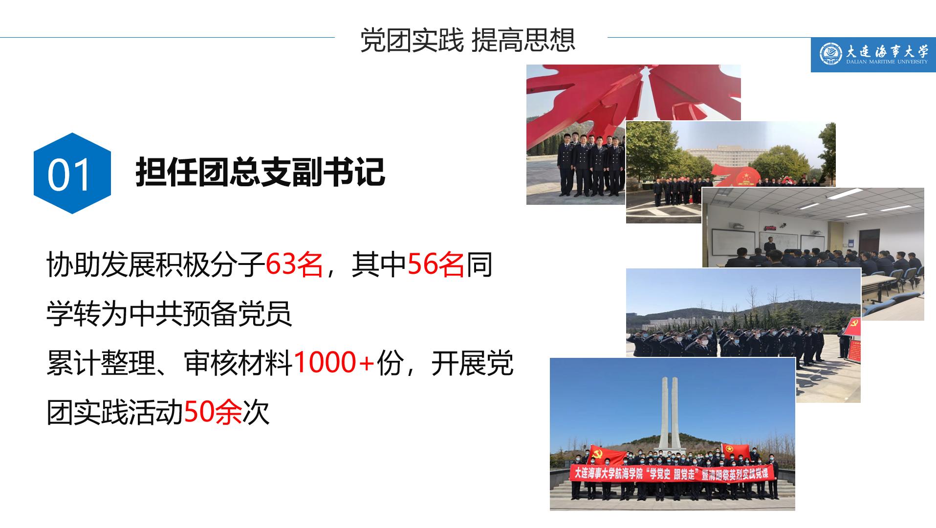 大一时,他便担任中队团总支副书记,协助发展积极分子63名,其中56名同学转为中共预备党员。累计整理、审核材料1000+份;开展党团建设会议90多次,开展党团实践活动50多次,累计撰写报告材料100+份。2020年,他加入青马工程班学习并顺利结业,在党员发展对象培训中获评“优秀学员”;2021年他作为唯一一名本科生,参加中共交通运输部党组党史学习教育第三巡回指导组谈话,并得到指导组的好评。累计获得优秀学生工作表彰6次。