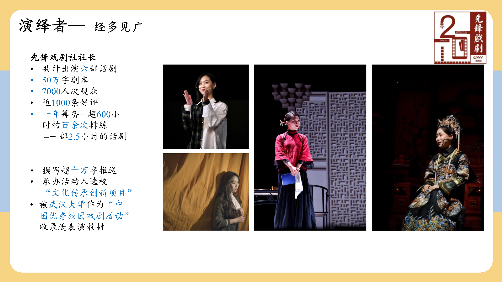 她曾任校“示范类社团”先锋戏剧社社长,出演6部话剧,执导并参演两部大戏,剧本总计50万字,累计观众达7000人次,后台收到近千条对大奶奶曾思懿,慈禧太后等她所饰演角色的好评。而为完美演出一部两个半小时的话剧,要用业余时间筹备一年,排练百余次,共600多小时。任期内,她组织十二次培训,撰写超十万字推送,社团体量创历史新高,承办活动入选校“文化传承创新项目”,并作为“中国优秀校园戏剧活动”被武汉大学收录进教材。在她的带领下,这个于1998年成立的社团历久弥新。