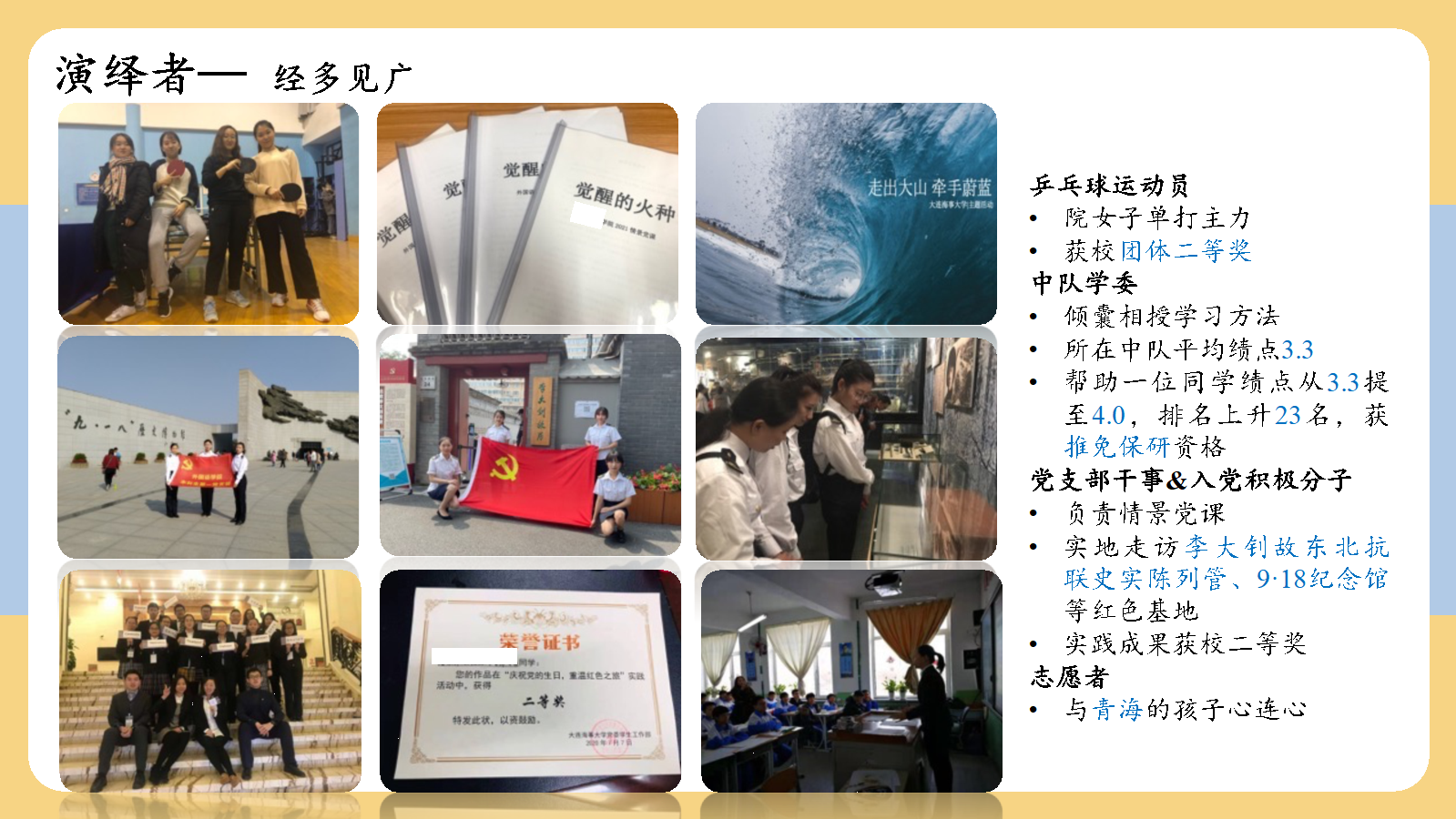 同时,她还是16年球龄的乒乓球员,代表学院参加比赛;是中队学委,倾囊相授学习方法,帮助一位同学绩点从3.3提升至4.0,排名上升23名,并最终获推免保研资格;是党支部干事,负责情景党课,实地走访红色基地;是志愿者,参与心连心活动,把“学汇百川 德济四海”的校训传播到青海的连绵山脉。