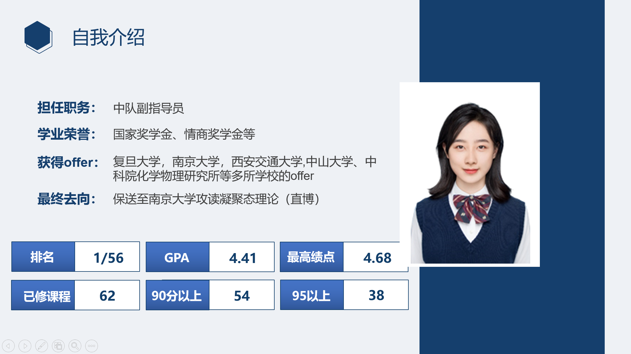 前六个学期加权平均绩点为 4.41(1/56),单学期最高绩点 4.68,在已修 62 门必修/限选课中,54 门成绩达到 90 分以上,38 门达到 95 分以上。连续两年获得国家奖学金,获得情商奖学金,大连海事大学五四青年奖章…一次性通过了国家英语四级、英语六级、计算机二级、计算机三级考试。在保研推免中,她拿到了复旦大学,南京大学,西安交通大学,中山大学,中科院化学物理研究所等多个院校的录取资格,最终选择保研至南京大学物理学院攻读凝聚态理论(直博)。