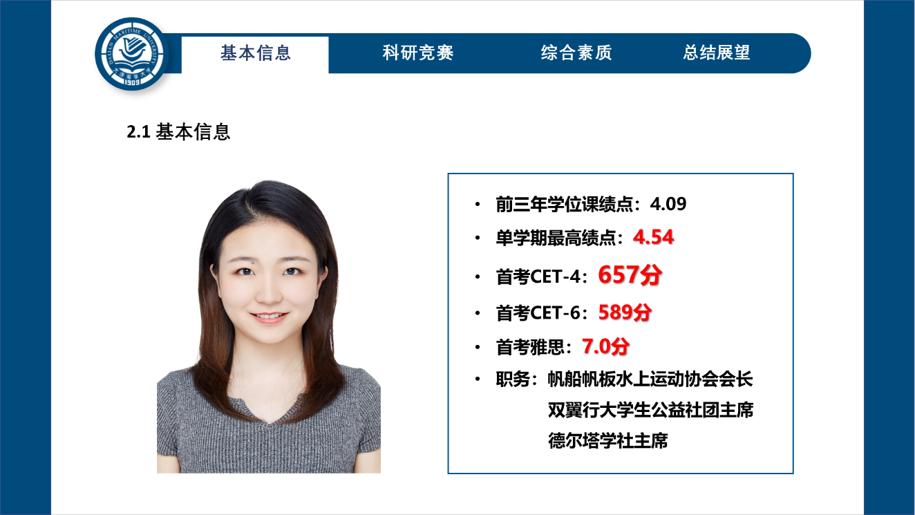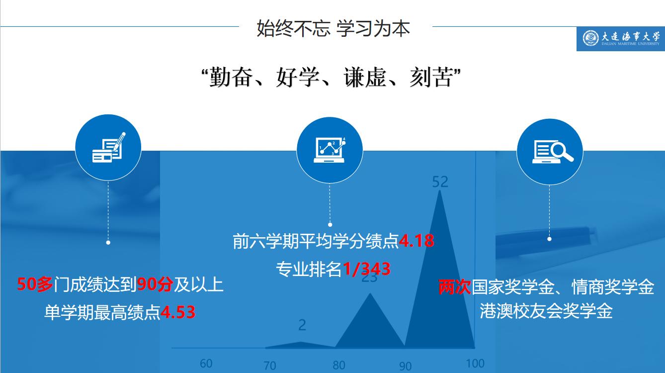 大一入学时作为新生代表在学院开学典礼上发言,揭开了她在海大求索向上的序章。第一学期以专业前5%的成绩转至交通运输,前三年学位课绩点4.09,最高绩点4.54,综合排名和学业排名均列专业前茅。已修完的课程中90分以上39门。一次性通过四级(657)、六级(589),自学首考雅思7.0。