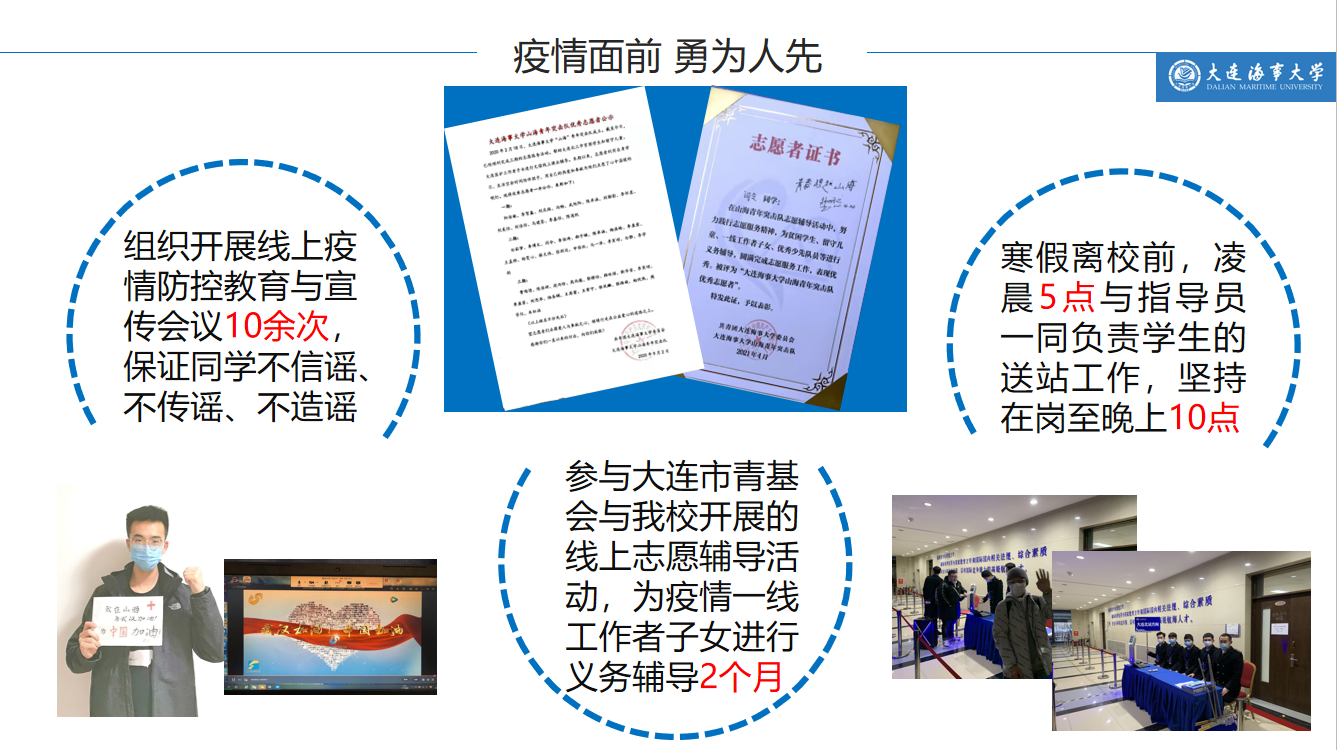 新冠疫情肆虐来临,他主动配合学院工作,组织开展线上疫情防控教育与宣传会议10余次;他还参与大连市青少年发展基金会与海大共同开展的线上志愿辅导活动,为疫情一线工作者子女进行义务辅导2个月,并获评“大连海事大学山海青年突击队优秀志愿者”称号。