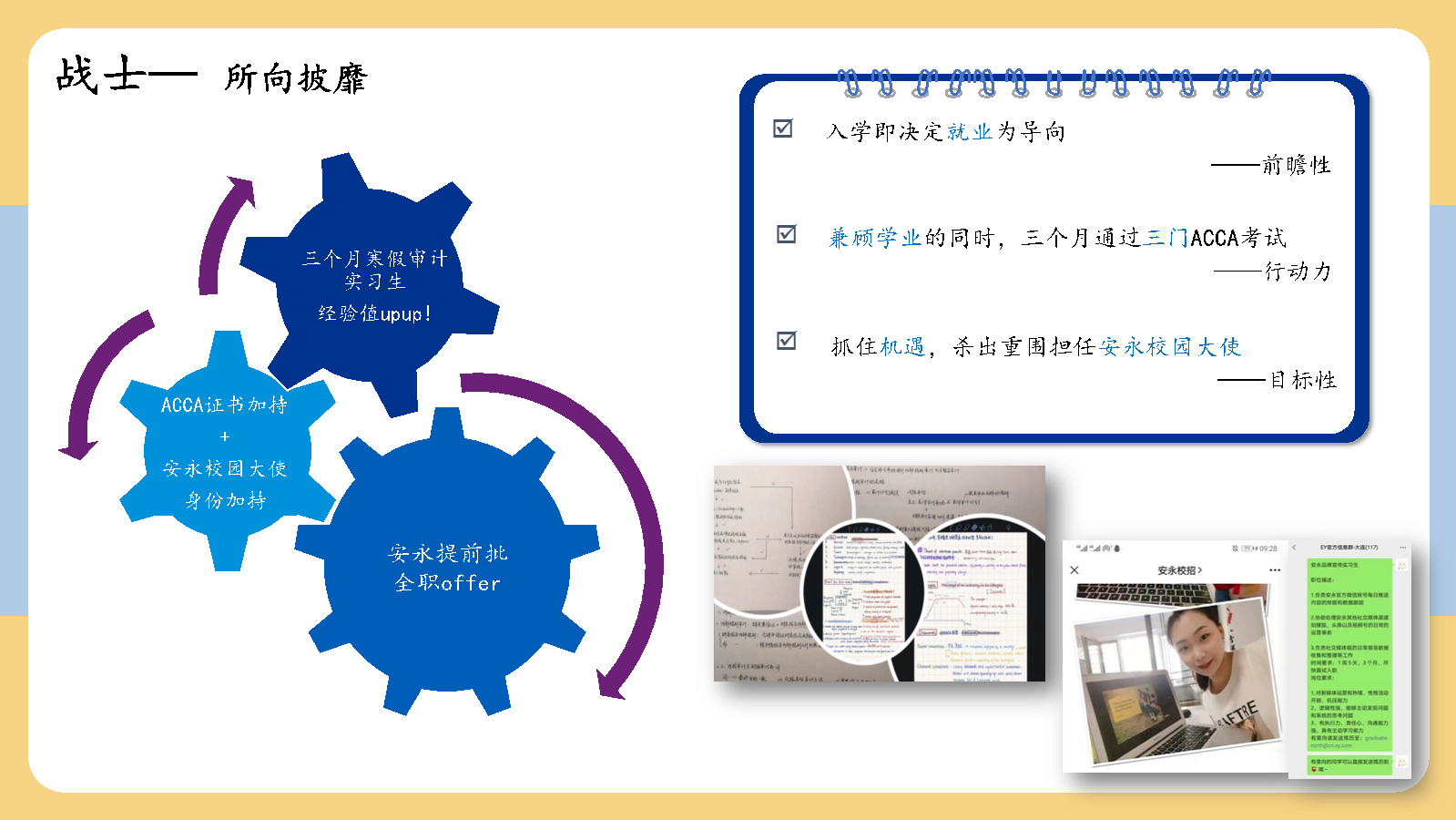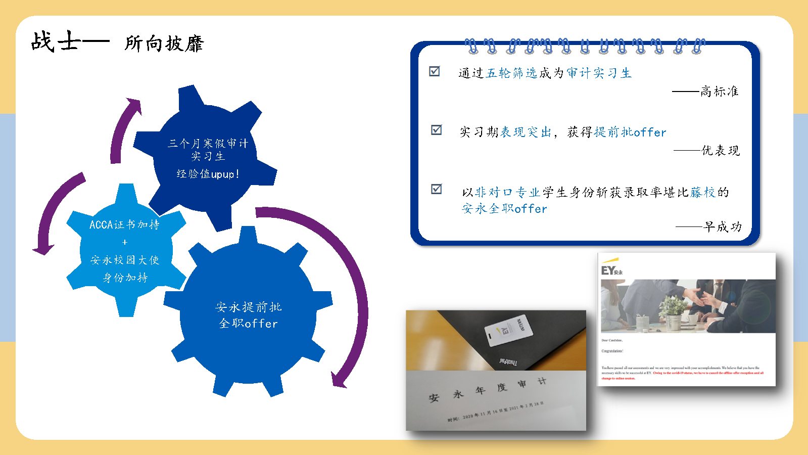 她入学即确定“语言+财经”为就业方向后,三年时间,铢积寸累,终成在求职战场上所向披靡的战士。目标明确,执行力强,兼顾学业的同时,她三个月通过三门ACCA考试;基于复合背景,她抓住机遇,在六千余名候选人中杀出重围,担任全球顶级四大之一,安永会计师事务所的校园大使,优异表现登上安永公众号;而后,她通过五轮筛选成为审计实习生,并且获得了提前批offer。一举以非对口专业学生身份斩获录取率堪比常青藤院校的安永全职工作。
