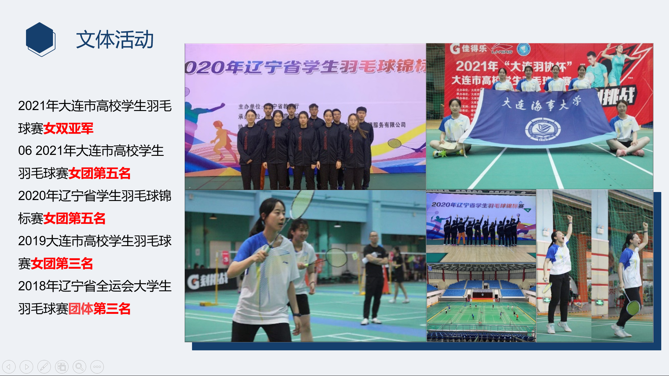 在课余生活中,她还加入了校羽毛球俱乐部,并任俱乐部主席、校羽毛球队队长,积极参加组织羽毛球竞赛,认真完成社团任务。同时,她还参与了各省市级羽毛球赛,其中获得了大连市高校杯大学生羽毛球赛女双亚军,辽宁省运动会大学生羽毛球赛团体第三名,大连市高校杯大学生羽毛球赛女团第三名…作为学校资助宣传大使,她积极加入生源地的母校行团队,宣传大连海事大学资助政策;作为中队副指导员,她平时乐于助人,热心回答同学们的专业问题。在假期闲暇之余,她经常去敬老院、中小学等地进行公益活动,累计公益时长57小时。
