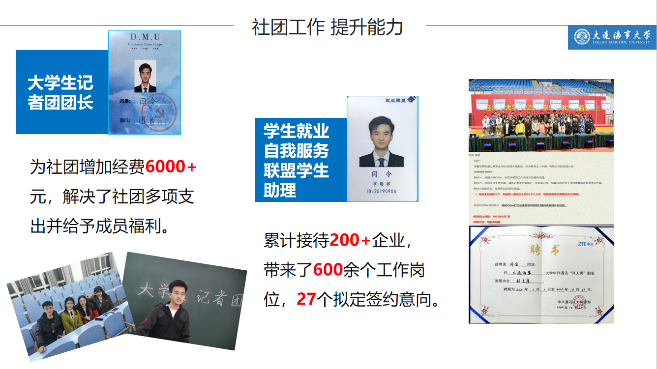 他担任校大学生记者团团长,为社团增加经费6000余元,组织大型校园活动10余场;他担任学生自我管理委员会学习部部长,坚持进行晚自习检查活动,累计工作时长800多个小时,并开展各类学习活动,帮助学弟学妹100余人;他担任学生就业自我服务联盟助理,累计接待企业200+,带来600余个工作岗位。目前,他还担任中兴通讯、华晨宝马等企业的校园大使,为就业的同学提供更多一手资讯。
