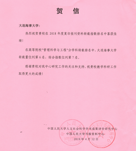 日前,中国人民大学书报资料中心发布《2018年度复印报刊资料转载指数排名研究报告》和《复印报刊资料重要转载来源机构(2018版)》两项成果。 2018年度复印报刊资料转载指数排行榜,共有约560种人文社科期刊和330家作者机构榜上有名。其中我校在2018年度复印报刊资料转载指数排名中喜获佳绩,在“管理科学与工程”学科转载排名中,转载量位列第6名,综合指数位列第7名。