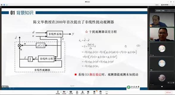 11月4日下午,江苏大学高效能电机系统与智能控制研究院院长,丁世宏教授应大连海事大学船舶电气工程学院邀请,在线上腾讯会议上做了一场题为《基于输入输出模型的新型干扰观测器设计》的高端学术报告,我校相关学科众多师生参加了此报告会。