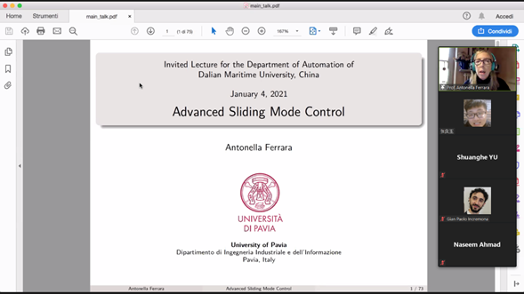 1月4日下午,意大利帕维亚大学Antonella Ferrara教授应大连海事大学船舶电气工程学院邀请,做了题为《Advanced sliding mode control》的学术报告。报告采用线上Zoom会议方式进行,米兰理工大学助理教授Gian Paolo Incremona博士及我校相关学科众多师生参加了报告会。