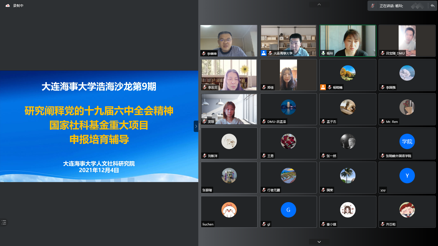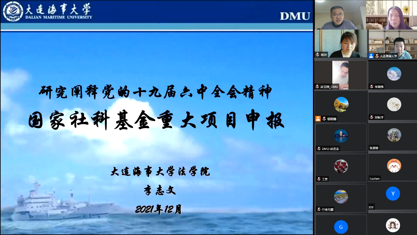 为提前做好关于研究阐释党的十九届六中全会精神国家社科基金重大项目申报工作,进一步提高我校国家社科基金项目申报质量,根据《2022年度国家社科基金申报工作方案》总体安排,12月4日上午,我校2021年第九期浩海沙龙“研究阐释党的十九届六中全会精神国家社科基金重大项目申报培育辅导”于线上成功举办。人文社科研究院院长李肇坤、法学院李志文教授、本次重大项目申报以及感兴趣的专家教师参加了本次沙龙。沙龙由人文社科研究院副院长杨玲主持。