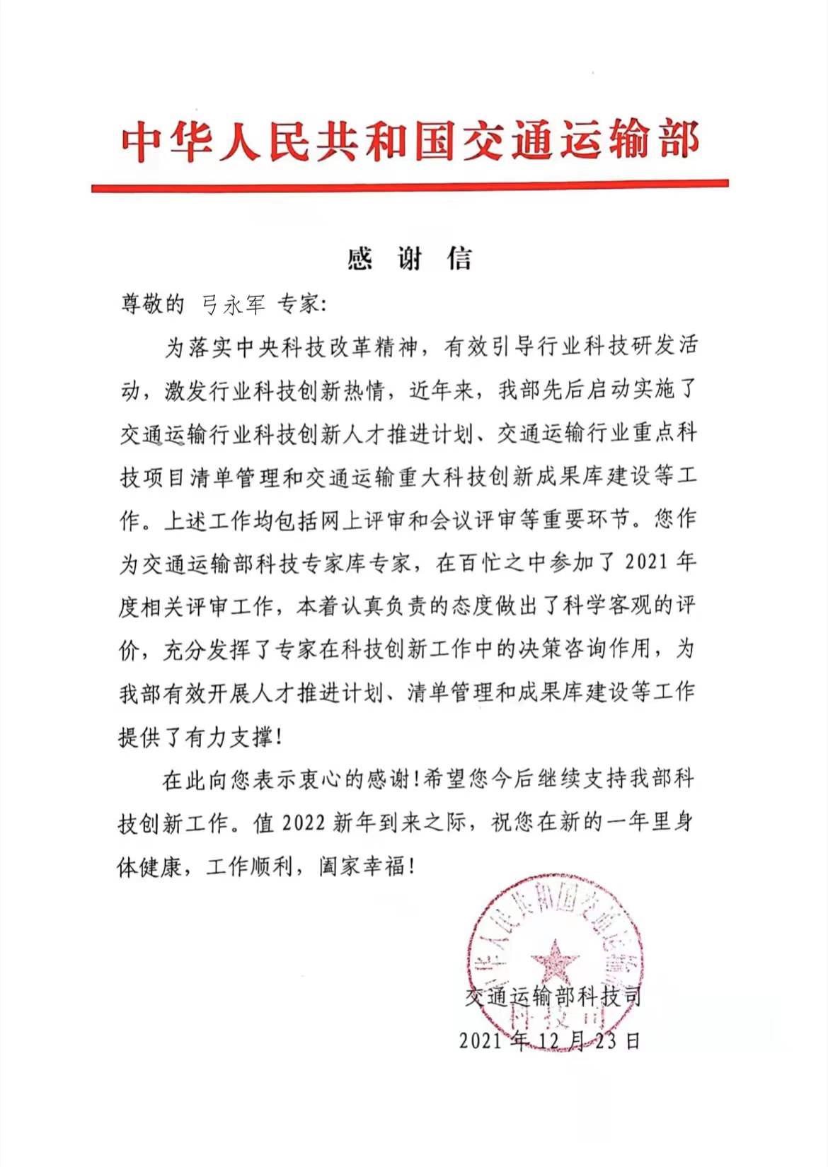 在感谢信中,部科技司、国际合作司分别向我校相关团队、平台和个人发来感谢信,对综合交通运输协同创新中心及其相关团队,对弓永军、匡海波、吕靖、贾鹏、李晶、李欣、常征、王爽、梁晶等同志在相关领域的工作付出表示诚挚感谢。