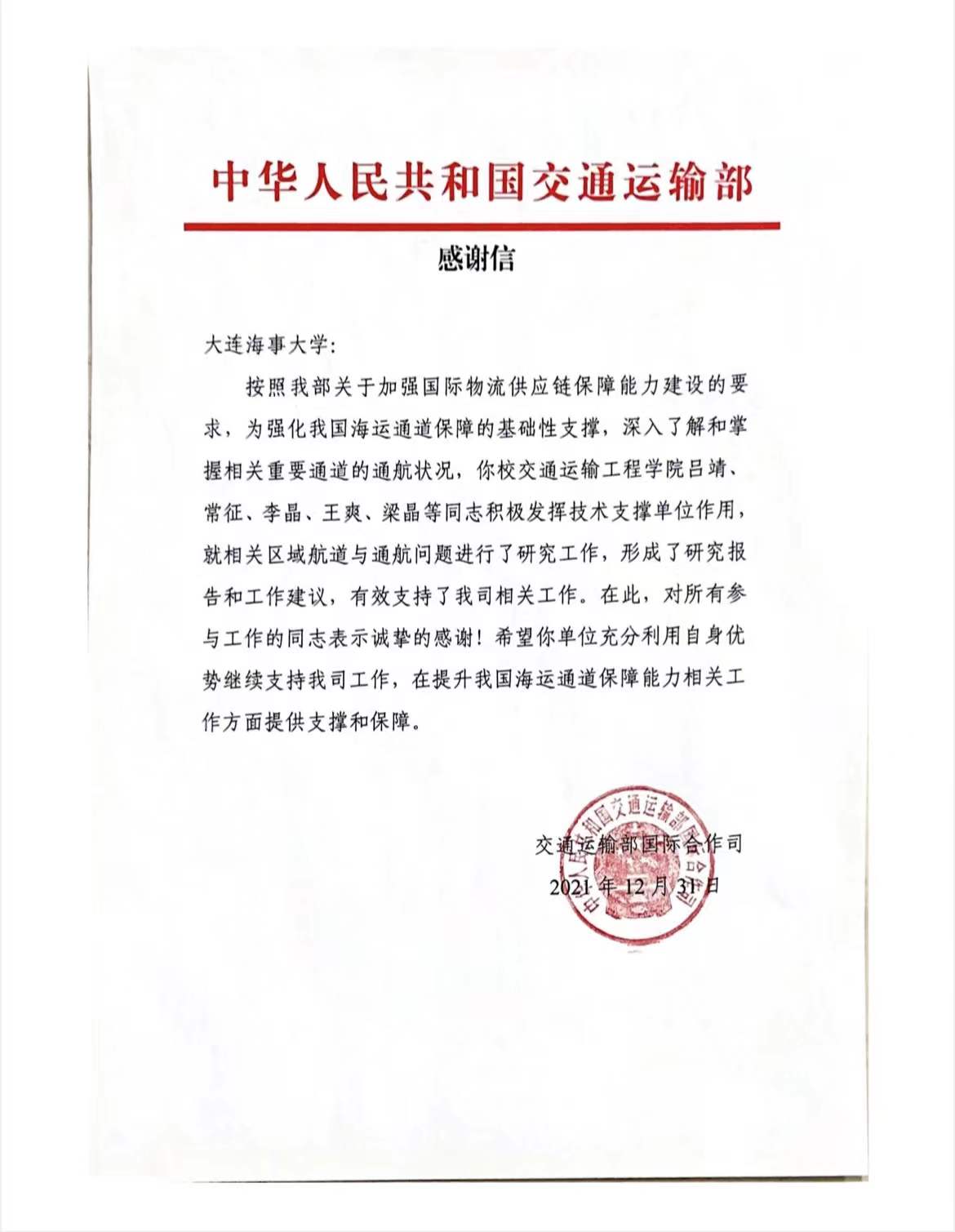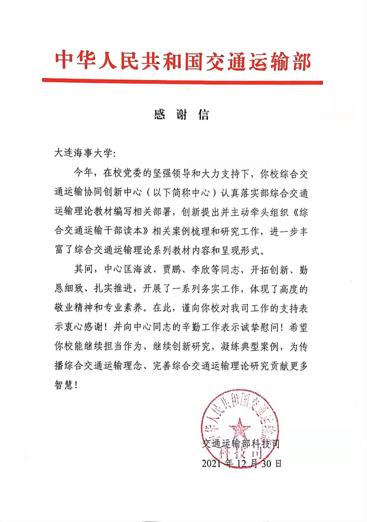 近日,学校收到交通运输部科技司、国际合作司发来的感谢信,对过去一年大连海事大学在交通运输行业科技创新领域所做出的贡献表示感谢。