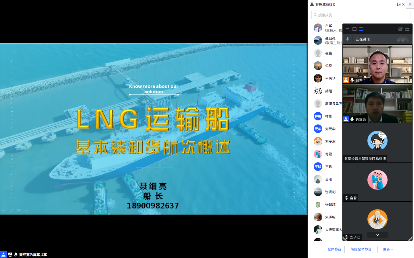 为进一步加深对LNG运输船基本装卸货航次情况的认识,增进对LNG运输船市场、营运基本流程的了解,2022年1月17日上午,航海学院特邀台州中油海运有限公司副总经理聂细亮船长作“LNG运输船基本装卸货航次介绍”线上报告,报告会由航海学院白军船长主持,学校相关师生参加了线上报告会。