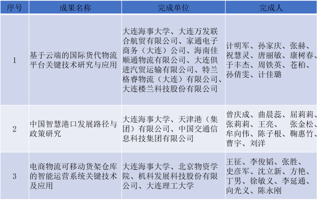 近日,中国物流与采购联合会正式公布了2022年度中国物流与采购联合会科学技术奖评审结果。我校交通运输工程学院计明军教授团队的“基于云端的国际货代物流平台关键技术研究与应用”、航运经济与管理学院曾庆成教授团队的“中国智慧港口发展路径与政策研究”和王征教授团队的“电商物流可移动货架仓库的智能运营系统关键技术及应用”成果均获得科技进步奖一等奖。这是我校首次在同一年度获得该奖项3项一等奖。