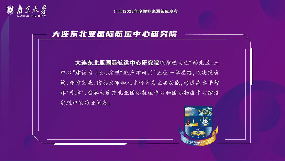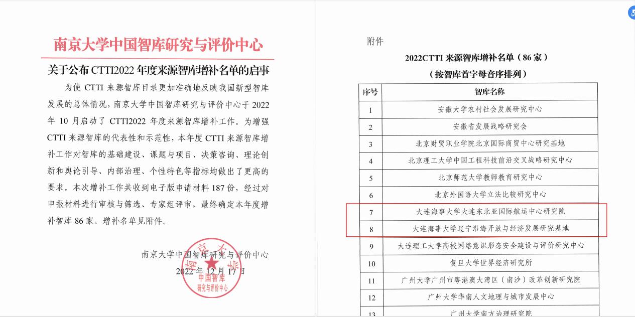 12月17日,由南京大学与江苏省社会科学院共同主办,南京大学中国智库研究与评价中心承办的“2022新型智库治理论坛”在南京举行。论坛发布了中国智库索引(CTTI)2022年度来源智库增补名单,我校大连东北亚国际航运中心研究院、辽宁沿海开放与经济发展研究基地2个智库机构新增入选。