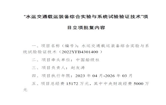 本项目属于2022年科技部重点研发计划专项“交通载运装备与智能交通技术”领域定向项目之一,是由中国船级社作为牵头单位,由我校赵友涛教授作为项目负责人,联合交通运输部水运科学研究所、武汉理工大学、北京数码易知科技发展有限责任公司等8家单位共同开展的科研项目,项目国拨经费5000万元。主要面向船舶智能、绿色、安全试验验证需求,开展顶层架构及体系研究,攻克船舶综合实验与系统试验验证关键技术,提升我国船舶综合实验与系统试验验证能力,服务 “交通强国”等国家战略。