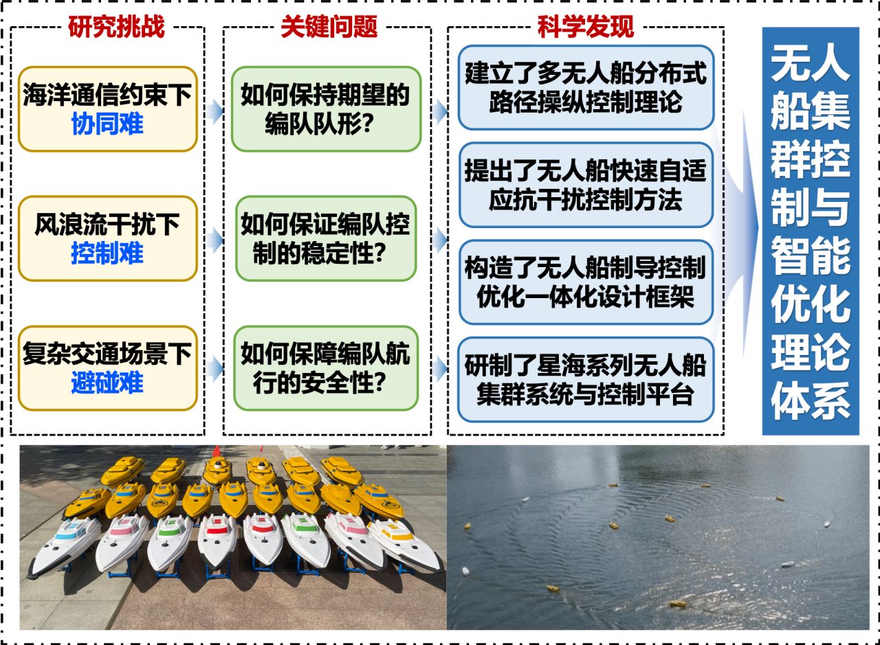 “多无人船分布式集群控制与智能优化”成果面向国家海洋强国、航运强国等重大战略需求,在国家自然科学基金重点项目、国家重点研发计划等国家级项目资助下,针对无人船集群面临的海洋通信约束下协同难、风浪流干扰下控制难、复杂交通场景下避碰难三大研究挑战,建立了多无人船分布式路径操纵控制理论,提出了无人船快速自适应抗干扰控制方法,构建了无人船制导控制优化一体化设计框架,研制了“星海”无人船集群系统与协同控制平台,实现了集群协同聚集、协同跟踪、协同包围、追逃博弈等群智行为。5篇代表作均发表在IEEE行业顶级期刊,成果得到国内外同行的广泛关注和高度评价,为国家智慧海洋和智能航运建设提供了理论技术支撑。