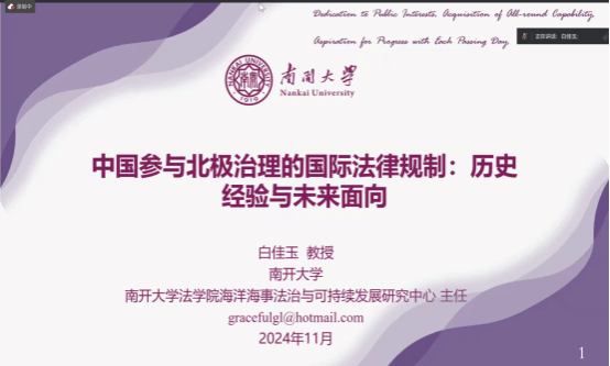 2024年11月14日上午,南开大学法学院白佳玉教授应邀通过腾讯会议作2024年浩海沙龙第12期(总第98期):“中国参与北极治理的国际法律规制:历史经验与未来面向”学术讲座。大连海事大学、中国海洋大学、吉林大学、中山大学、哈尔滨工程大学等多校师生160余人参加了本次讲座,讲座由大连海事大学“浩海工程”培养人选韩立新教授主持。