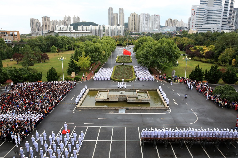 昨日是中华人民共和国成立69周年,大连海事大学举行了隆重的国庆升国旗仪式。在校师生、离退休教师以及专程前来观礼的社会各界群众等2500余人参加升国旗仪式。上午8时,升旗仪式正式开始,英姿飒爽的国旗护卫队迈着铿锵有力的步伐,护送着国旗行进至升旗台。伴随着雄壮的中华人民共和国国歌,鲜艳的五星红旗冉冉升起,现场观众庄严肃立,面向国旗行注目礼。仪式结束后,仰望着迎风飘扬的五星红旗,参加升国旗仪式的师生和自发前来观看升旗的群众齐声高唱《我爱你中国》《走向复兴》等爱国主义歌曲,抒发了对祖国的无限热爱之情,共同祝福祖国繁荣昌盛。