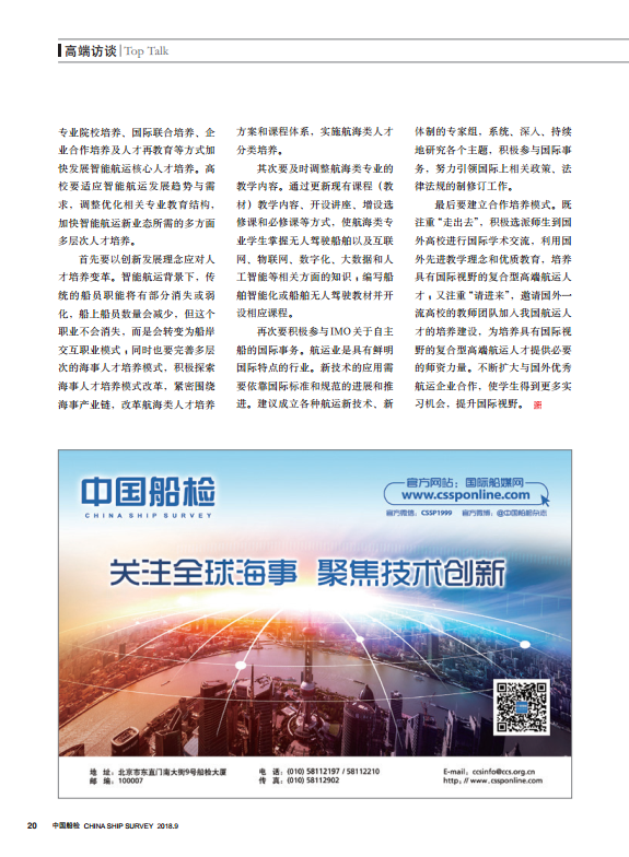 孙玉清:要有针对性的分析智能航运新业态下人才需求变化,以专业院校培养、国际联合培养、企业合作培养及人才再教育等方式加快发展智能航运核心人才培养。高校要适应智能航运发展趋势与需求,调整优化相关专业教育结构,加快智能航运新业态所需的多方面多层次人才培养。