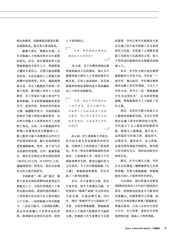 随着国际海事业的飞速发展,船舶大型化、智能化以及无人船、智能港口的出现对如今海事人才的培养提出了更高的要求。在智能时代来临的当下,我国的海事人才面临哪些新的挑战,作为海事人才培养的高等学府,大连海事大学又采取了哪些与时俱进的措施积极应对?对此,本刊记者专访了大连海事大学孙玉清校长。