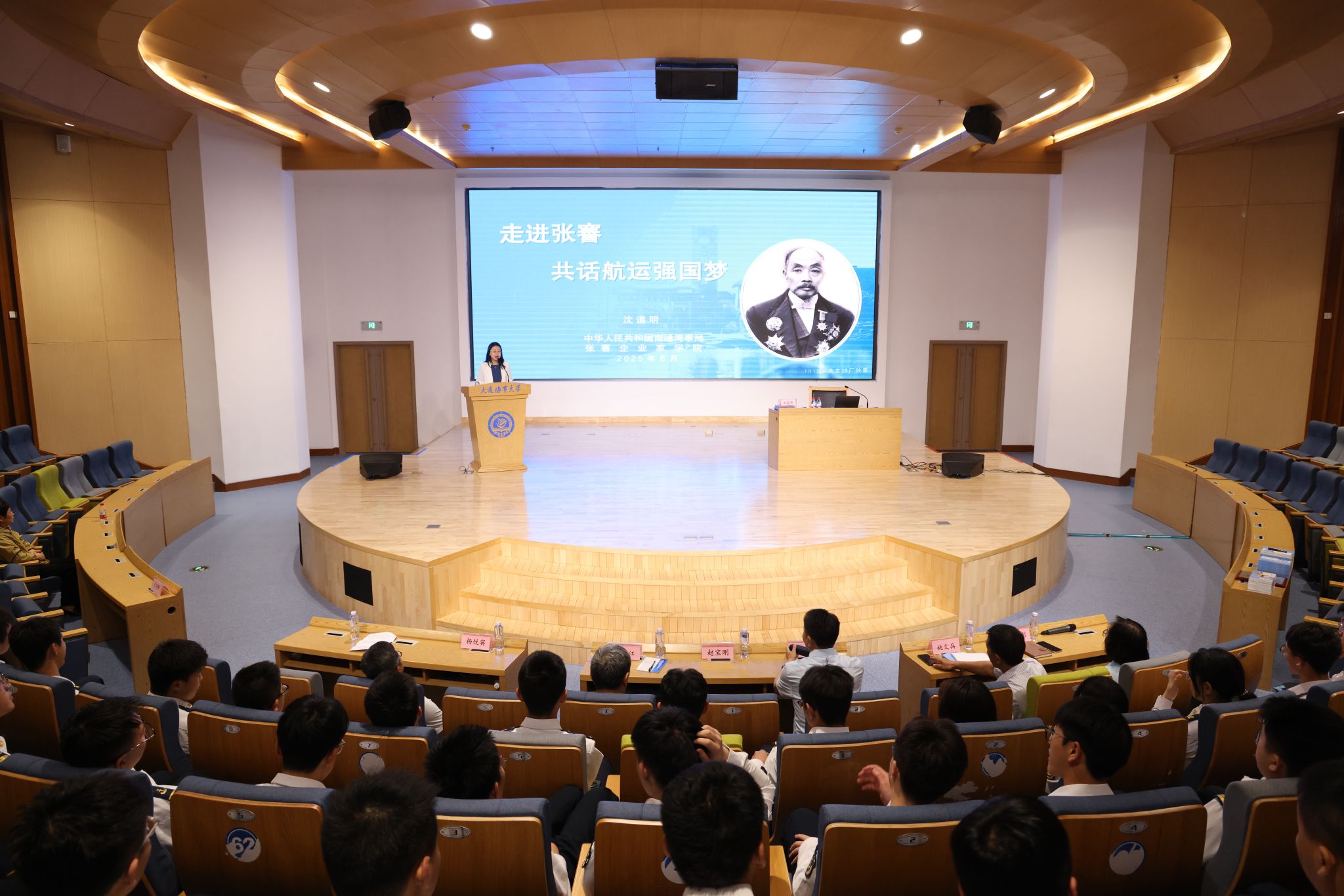 为传承民族航运精神,共铸蓝色梦想,6月5日下午,学校于新图书馆学术报告厅举行“走进张謇,共话航运强国梦”专题报告会,邀请《走进蔚蓝——张謇与港航现代化》一书主编、张謇企业家学院特聘指导员沈道明作报告。副校长赵宝刚、原副校长刘正江出席活动,学校300余名师生参加了报告会。沈道明结合历史资料,详细介绍了张謇在一百多年前兴办实业、发展港航业的艰难历程,特别是为“挽救航权”而推动创办吴淞商船学校的过程,总结出“...